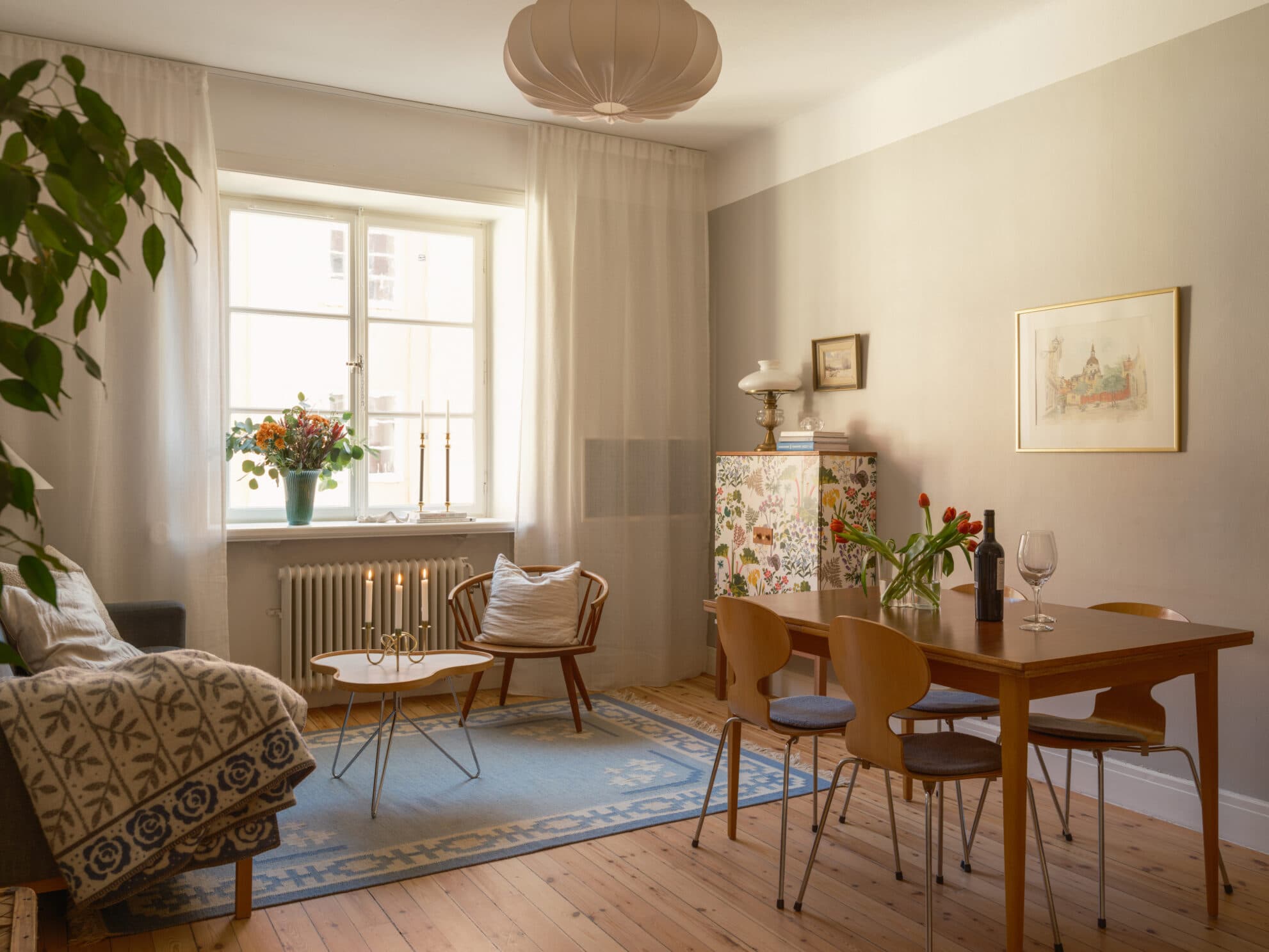 Ett stort och härligt rum med fint spröjsat fönster ut mot innergården och mot öster. Här finns gott om plats för matbord och soffa. Den platsbyggda bokhyllan inger en fin känsla.