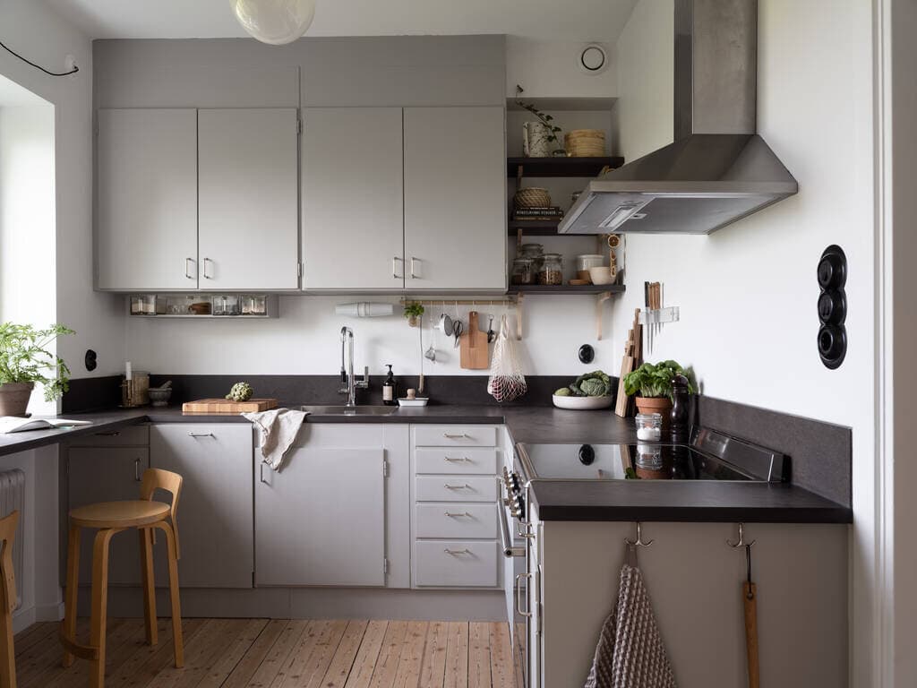 Med begagnad och restaurerad skåpinredning i gediget kärnträ har ett lika välplanerat som charmigt funkiskök återskapats. Här är det väl tilltaget med både förvaring och arbetsyta, och den förlängda köksbänken vid fönstret fungerar även som matplats. Utsikten bort mot Liseberg och Örgryte ger en underbar frihetskänsla. Bänkskivorna är liksom stänkskyddet i mörkgrå Valchromat och skåpen, med överfalsade luckor och lådor, har målats med en mellangrå färg. Spisen, fläkten och den fristående kylen/frysen är i rostfri design medan diskmaskinen är integrerad i inredningen. Kylen/frysen – i franskt utförande – och spisen – med induktionshäll – är av märket Smeg. Alla vitvaror sattes in i samband med helrenoveringen av köket 2019. Diskhon är infälld i köksbänken och den stiliga blandaren, med utdragbar pip, kommer från Tapwell. Köket har framtaget brädgolv och väggarna är målade med färgen ”Klassisk Vit”.
