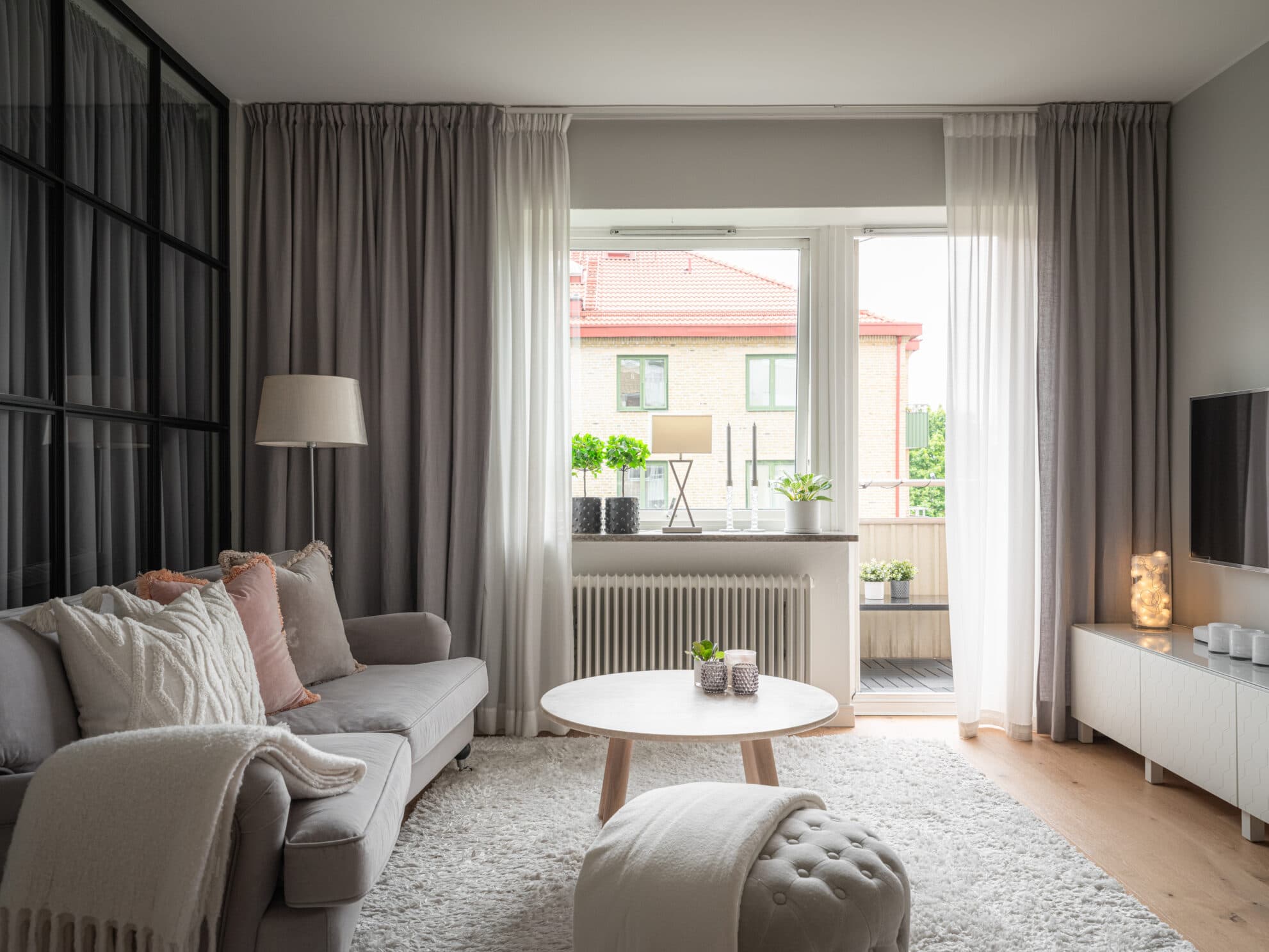 På våning två (hiss finns) finner vi denna stora trerummare med öppen, luftig och social planlösning. Lägenheten vetter mot väst, och under sommarhalvåret har balkongen sol till cirka fyra på eftermiddagen. Ljuset strömmar in, och de djupa fönsternischerna pryds av eleganta kalkstensfönsterbänkar som liksom gjutjärnsradiatorerna. Lägenheten har en fin blandning av modern stilrenhet och gammaldags charm.