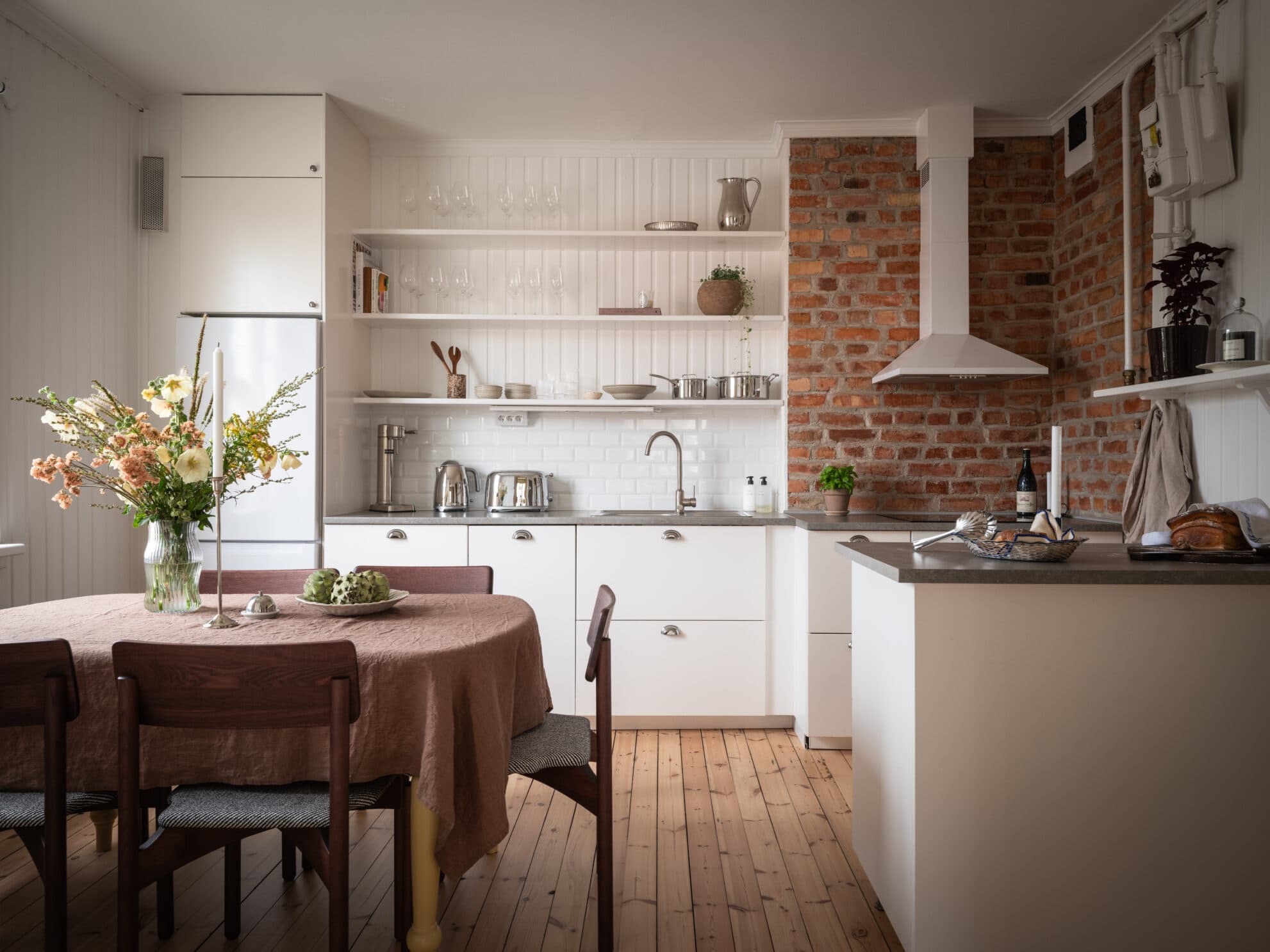 Köket bjuder in till både matlagning och umgänge, och det finns plats för att duka upp till stora middagar. Hemmakockarna har gott om svängrum, och tack vare öppningen mot vardagsrummet har man kontakt med gästerna. Det är väl tilltaget med förvaring och köksskåpen har vita luckor med fina knoppar och beslag. Köket är utrustat med spis, fläkt, kyl/frys och diskmaskin som är integrerade i inredningen. Det framtagna brädgolvet är slipat, och kökets vackra väggspont är målat i vitt.