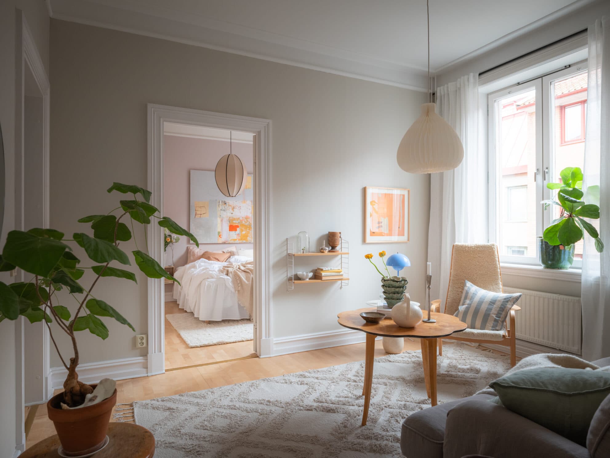 Vardagsrummet ligger i västerläge med stora fönster som släpper in rikligt med eftermiddagsljus och ger en varm, trivsam känsla. I samband med att ett mindre sovrum skapats i anslutning till rummet har vardagsrummet fått en mer kompakt men fortfarande funktionell planlösning. Här ryms soffa, mediemöbel och ett par mindre möbler, och rummet behåller sin ljusa och luftiga känsla tack vare färgsättningen i ljusbeige och det vackra parkettgolvet som löper vidare från övriga delar av bostaden. Trots sin nya storlek är det ett ombonat och inbjudande rum med en tydlig social prägel.