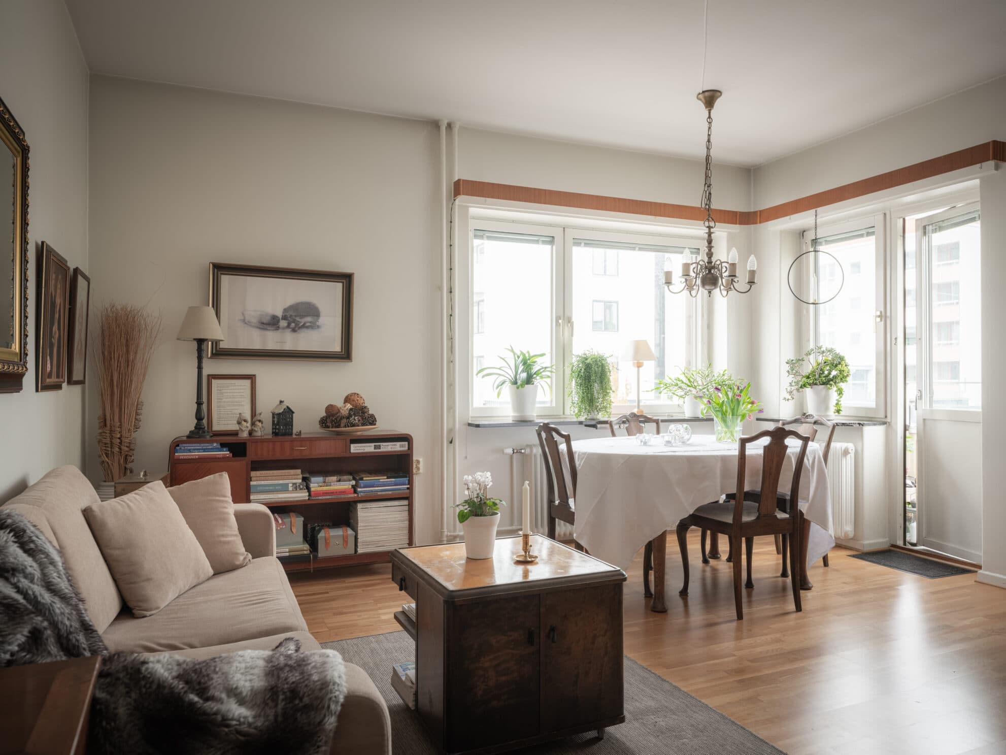 Lägenhetens vardagsrum är ett härligt hörnrum som tack vare fönster i både sydväst och sydost badar i ljus. Här finns även utgång till en underbar hörnbalkong med sol från tidig morgon fram till kvällsskymningen. Utsikten över den vackra trädgården och bort mot Masthuggskyrkan åt det andra är hänförande. Vardagsrummet är rymligt och det finns gott om plats för både soffa och matgrupp. På golvet finner ni ett vackert parkettgolv och väggarna är målade med en ljus kulör.
