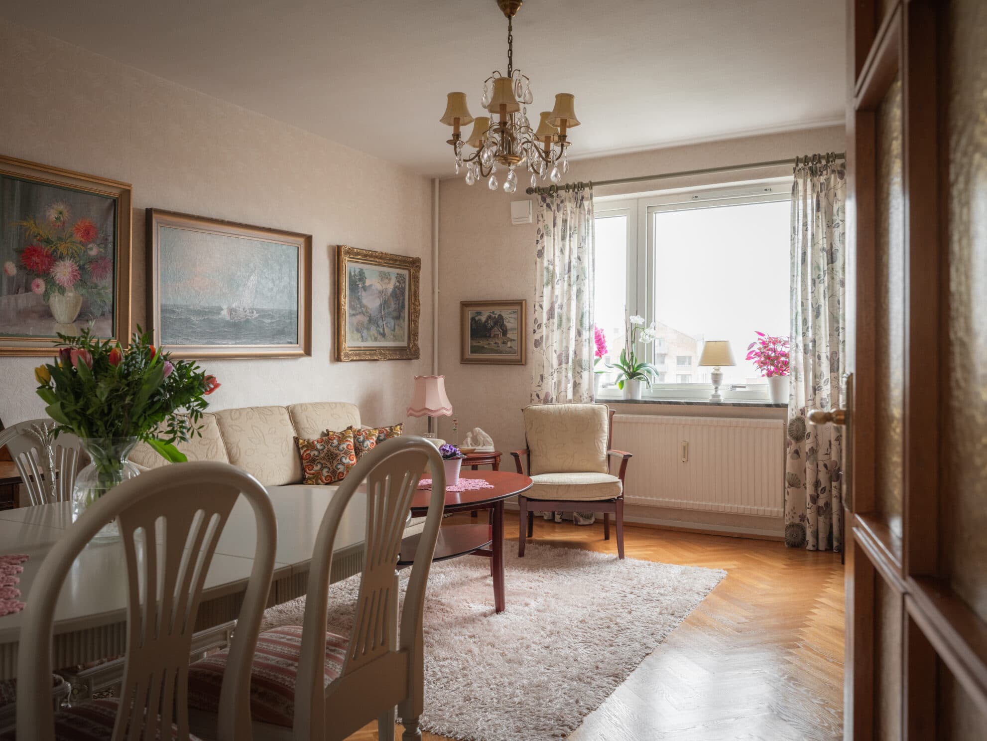 Vardagsrum med ljust tapetserade väggar och parkettgolv i orginalskick. Här har ni ett härligt ljusinsläpp från fönster i sydvästläge med utsikt över Majornas takåsar och Sjömanshustrun. Enkelt möblerat rum med plats för både matgrupp och soffgrupp. I anslutning till vardagsrummet finner ni en stor och praktisk garderob.