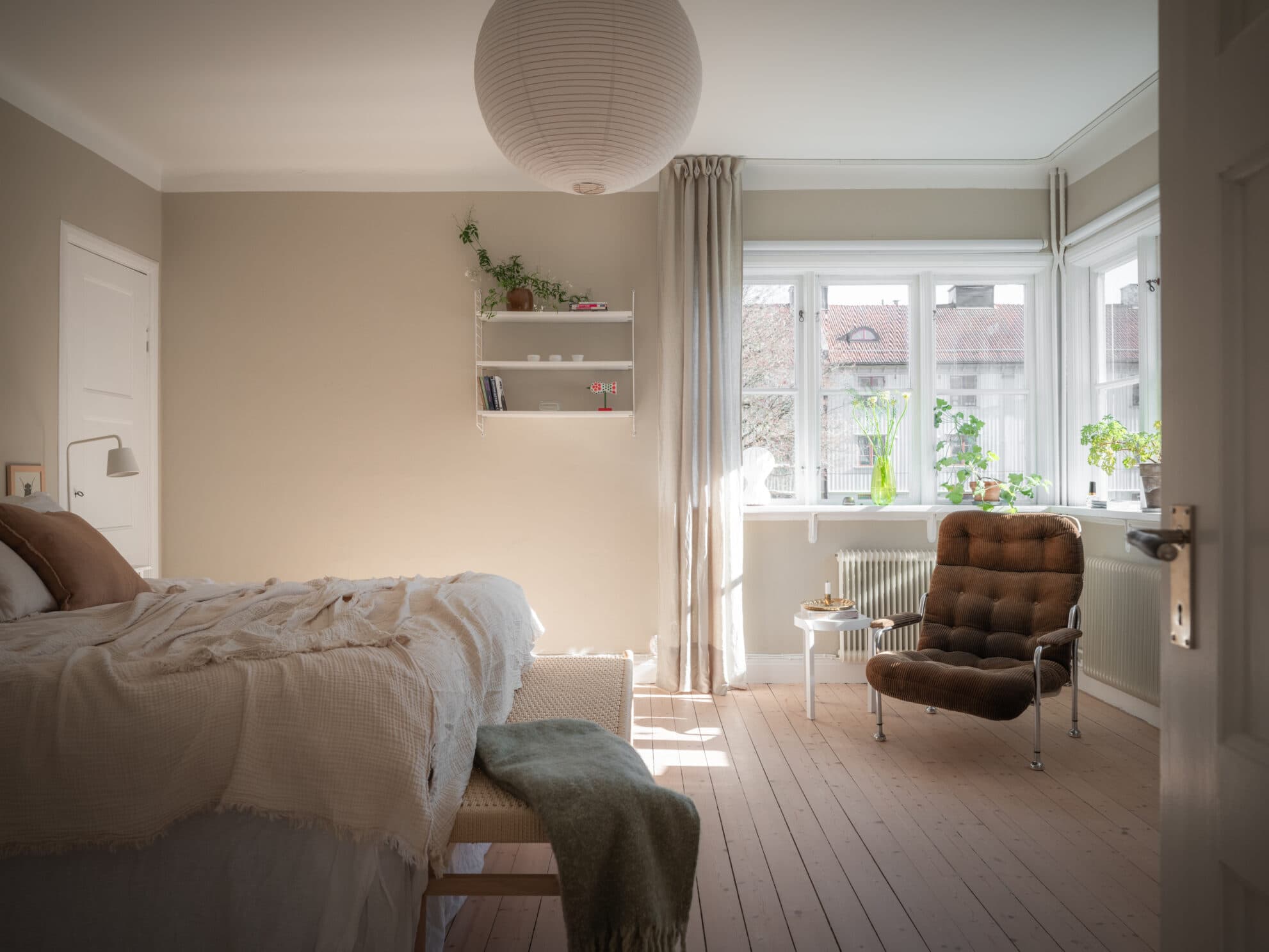 Rymligt sovrum med två vackra treluftsfönster som sitter i vinkel. En dubbelsäng med nattduksbord samt en läshörna ryms lätt och ledigt. God förvaring tack vare tre dubbla garderober som har byggts in. Väggarna är målade i en behaglig beige ton från Jotun (sand).