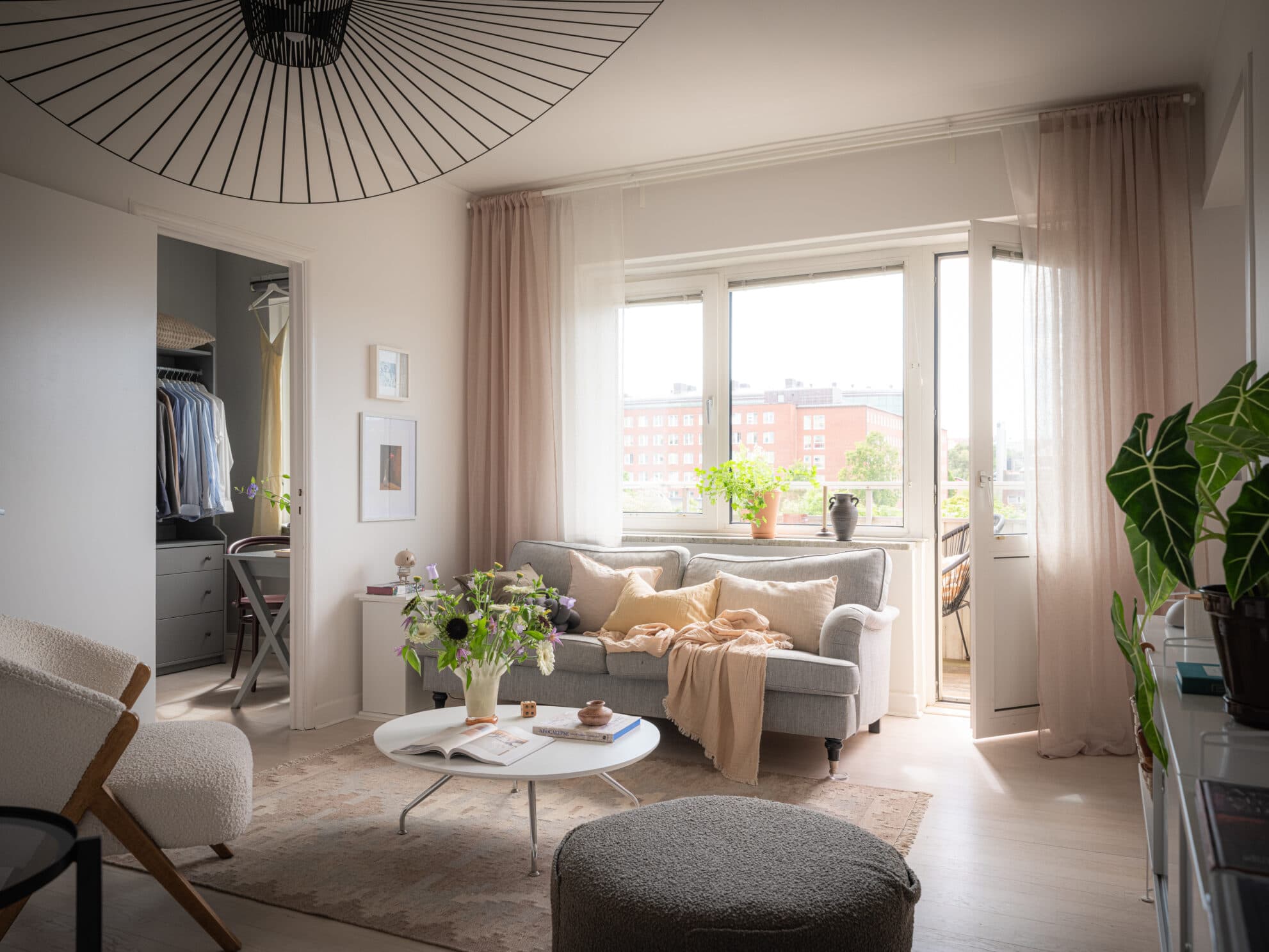 Vardagsrummet badar i ett fantastiskt ljus tack vare det stora fönsterpartiet och den generösa balkongdörren. Rummet har en luftig känsla och erbjuder gott om plats för såväl soffgrupp som annan möblering – här skapas enkelt en trivsam och social yta. Från vardagsrummet nås den härliga balkongen med högt och fritt läge, där eftermiddags- och kvällssolen kan avnjutas i rofylld miljö. Ljusa väggar och brädgolv i original samspelar fint och förstärker rummets harmoniska och inbjudande atmosfär.