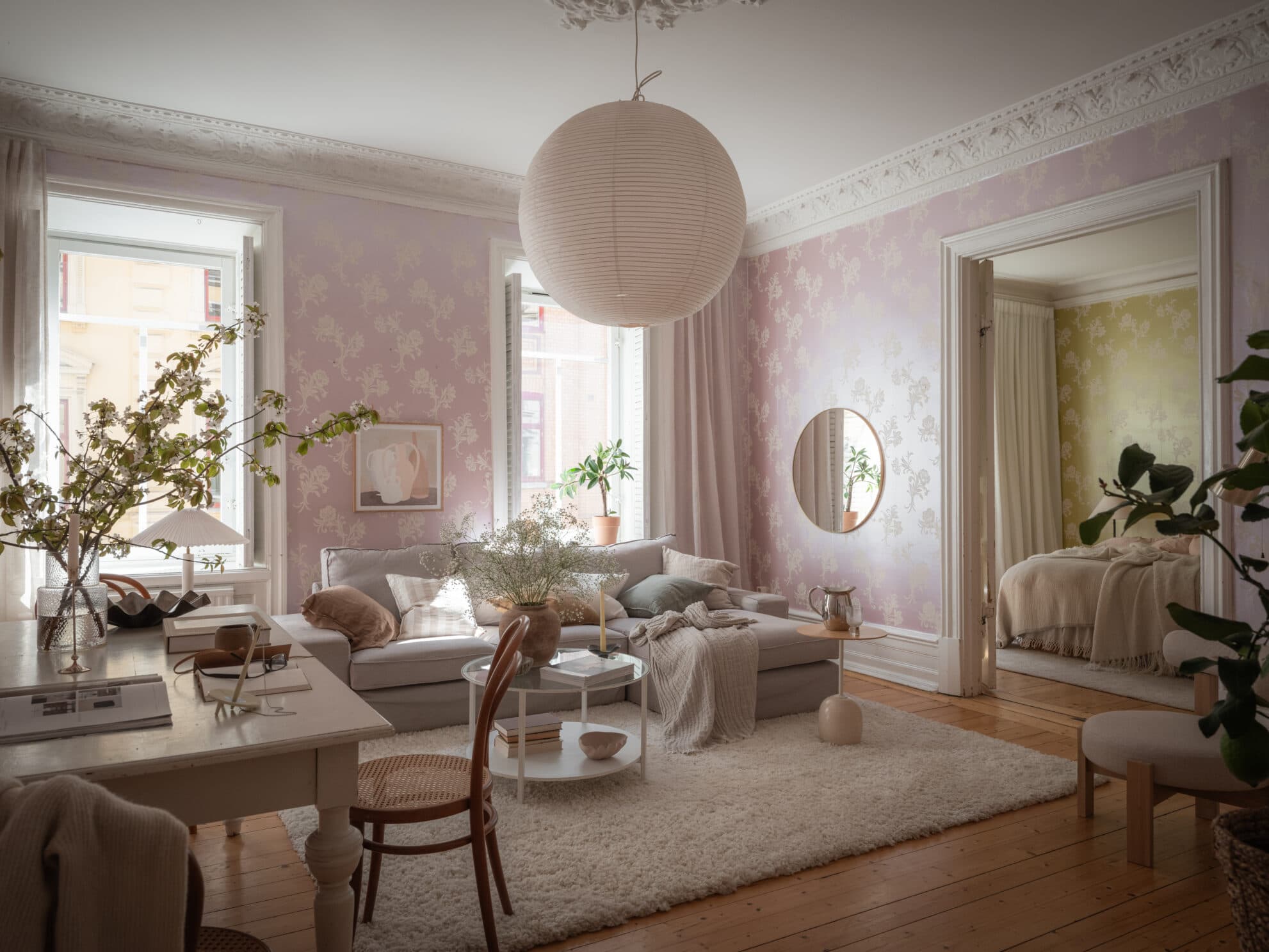 Ett pampigt och inbjudande rum med lila tapet i klassisk stil och två stora fönster som flödar rummet med ljus. En kakelugn i hörnet blir ett vackert blickfång och här finns gott om plats för både soffgrupp och matsalsmöbler. Originaldetaljerna förstärker rummets historiska karaktär.