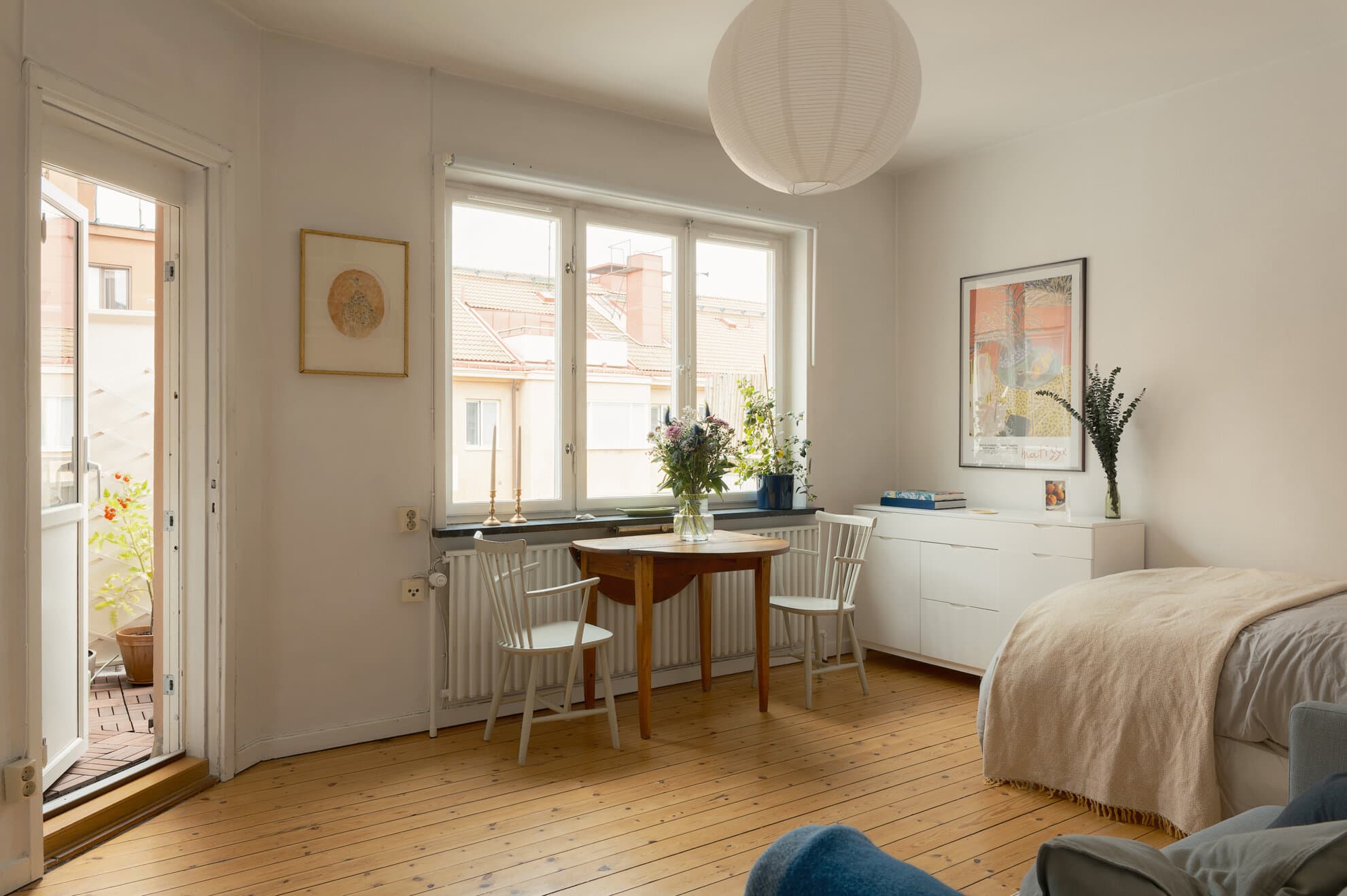 Ljust och fint vardagsrum med vackert trägolv och ett stort fönsterparti som tillåter ljuset att stråla in. Trevlig matplats intill fönstret och mysig sovplats i andra änden av rummet. Stor klädkammare ger god förvaring.