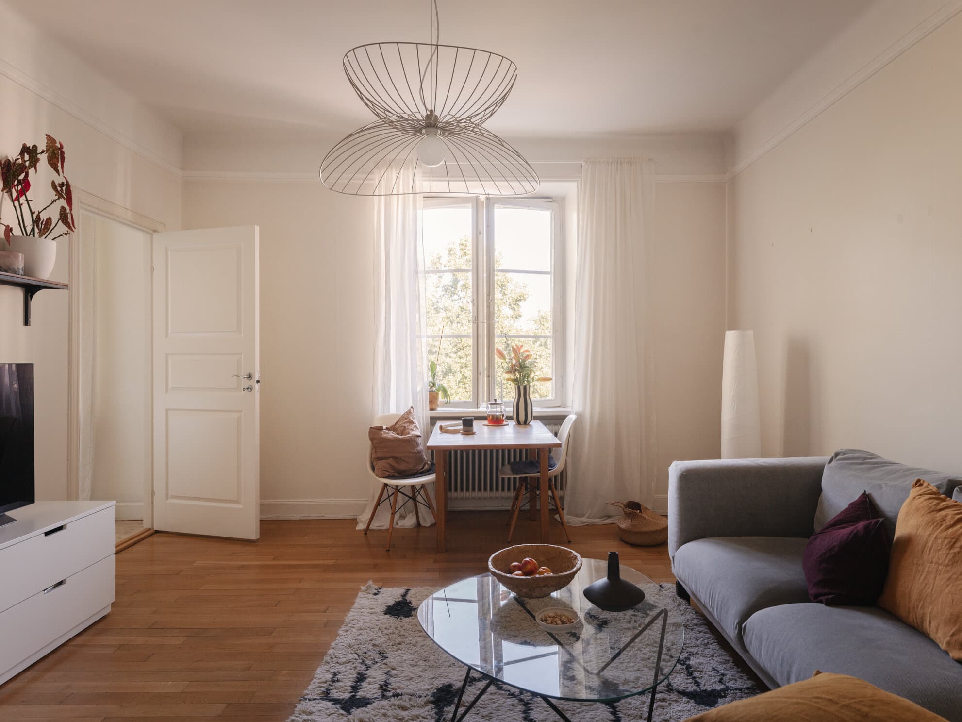 Det generösa vardagsrummet bjuder på en ljuvlig rymd och ett stort fönster där både trädtoppar och himmel breder ut sig som levande tavlor. Rummet låter sig enkelt möbleras med både soffa, tv-möbel och – för den som önskar – en matplats intill fönstret där man gärna dröjer sig kvar med kaffekoppen. Originalgolv och vackra detaljer förstärker rummets inbjudande karaktär.