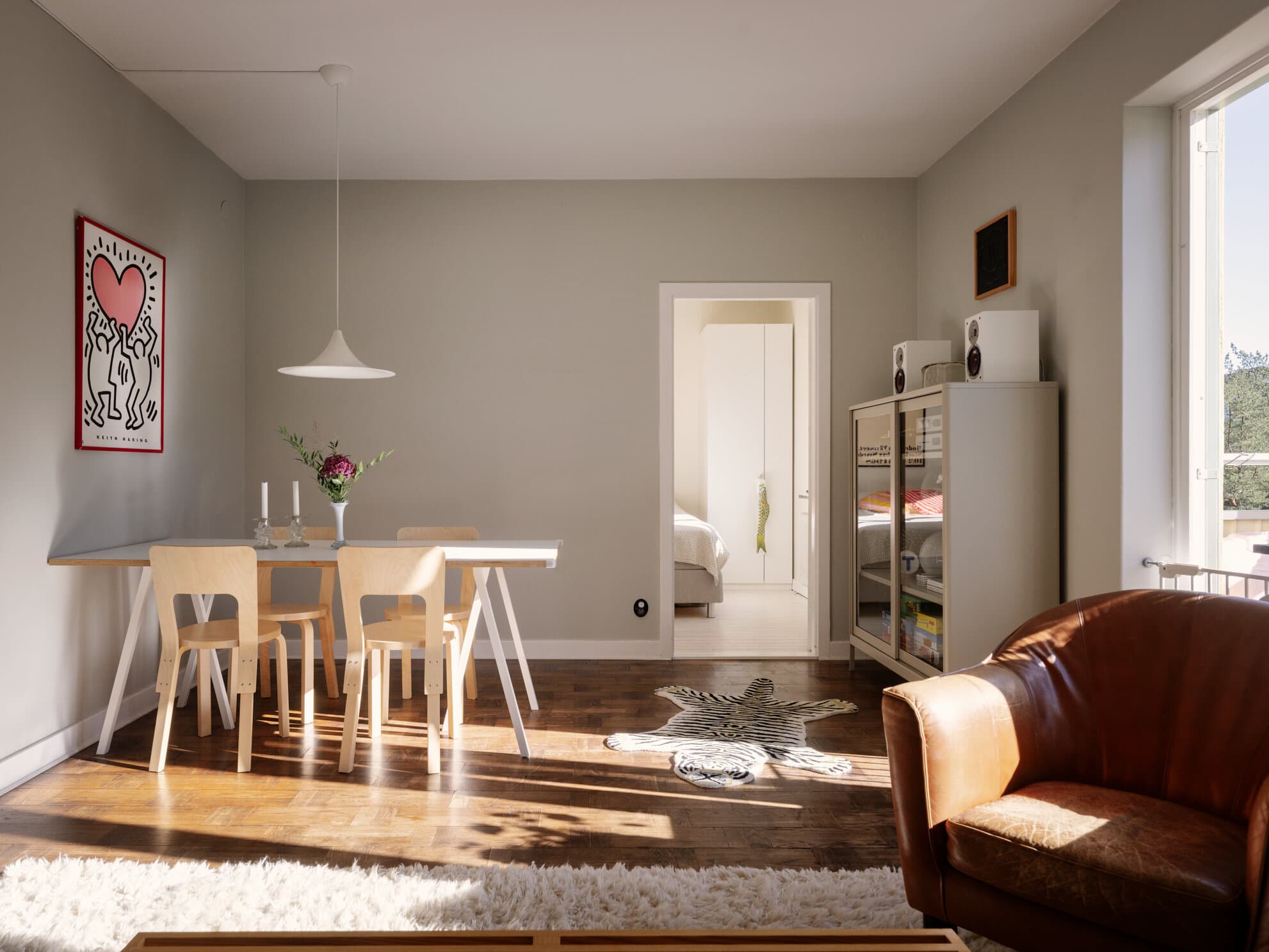 Genomgående ljus funkistrea med generös takhöjd och balkong mot lummig gård
