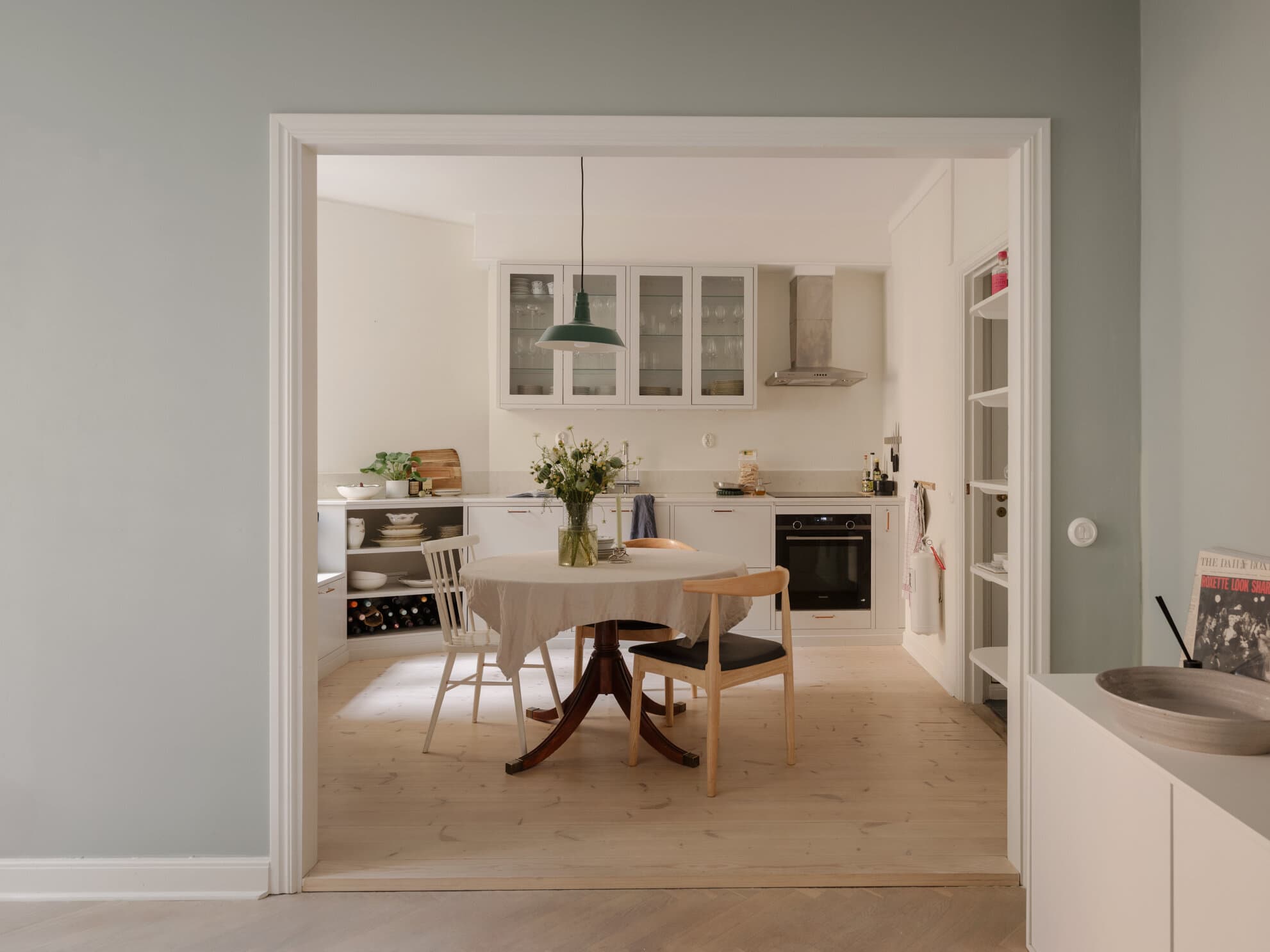 Ljust och inbjudande vardagsrum i öppen planlösning mot köket – en naturlig plats för socialt umgänge. Det stora spröjsade fönstret släpper in rikligt med dagsljus och rummet ramas in av fina detaljer som eleganta elementsskydd, ljuslaserad fiskbensparkett och högt i tak. Här finns plats för soffa, soffbord och mediamöbel. Den öppna planlösningen skapar en luftig atmosfär där matlagning och umgänge smälter samman. Det öppna läget och grönskan utanför bidrar till en lugn och insynsskyddad känsla. Från rummet nås brandbalkongen – en trivsam plats för morgonkaffe bland trädtopparna med en känsla av New York.