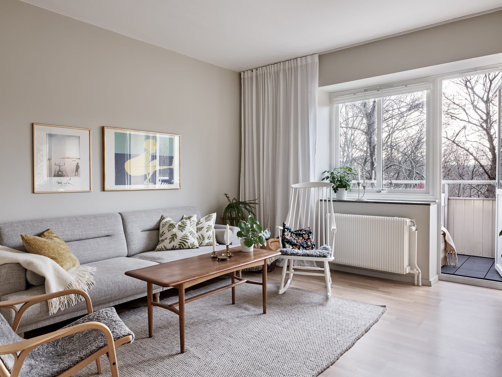Fönstren i söder fyller lägenhetens vardagsrum med ljus och under sommarhalvåret har balkongen många härliga soltimmar. Rummet är lättmöblerat och det finns gott om plats för soffgrupp, TV-bänk, läsfåtölj och bokhyllor. Väggarna är målade i ljusgrått och ekparkett löper tröskelfritt genom öppningen mot hallen.