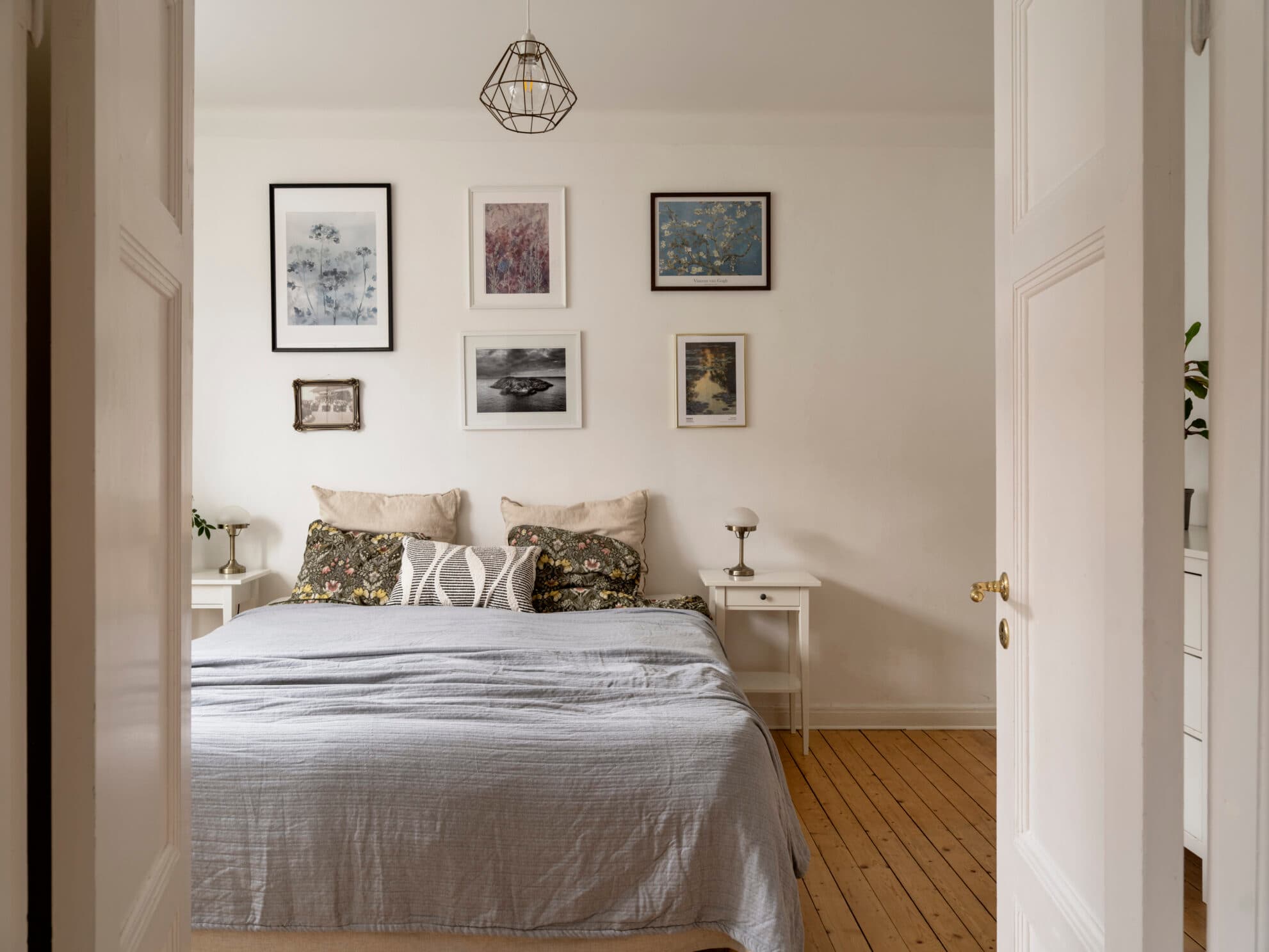 Parspegeldörrar öppnar och skiljer av mot sovrummet som även nås direkt från hallen. Här ryms en dubbelsäng med nattduksbord lätt och ledigt, och det finns även gott om plats för att komplettera rummets garderober med ytterligare förvaringsmöblemang. Brädgolvet är framtaget och väggarna målade i vitt.