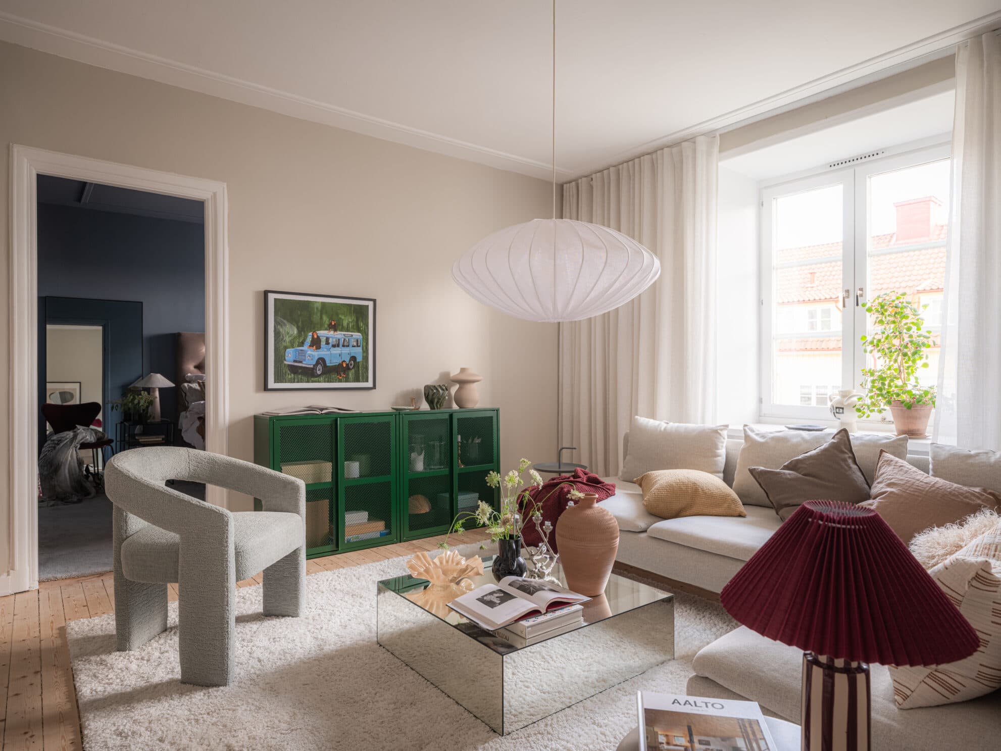 Ett fönster fyller vardagsrummet med ett härligt ljus, och liksom i övriga lägenheten bidrar den generösa takhöjden till en luftig och behaglig atmosfär. Rummet är lättmöblerat och erbjuder gott om plats för en stor soffa, tv-bänk och byrå. Originalbrädgolvet är framtaget och löper vidare i hela lägenheten, det finns även bevarat under mattan i sovrummet. Väggarna är målade med Jotuns "kalk".
