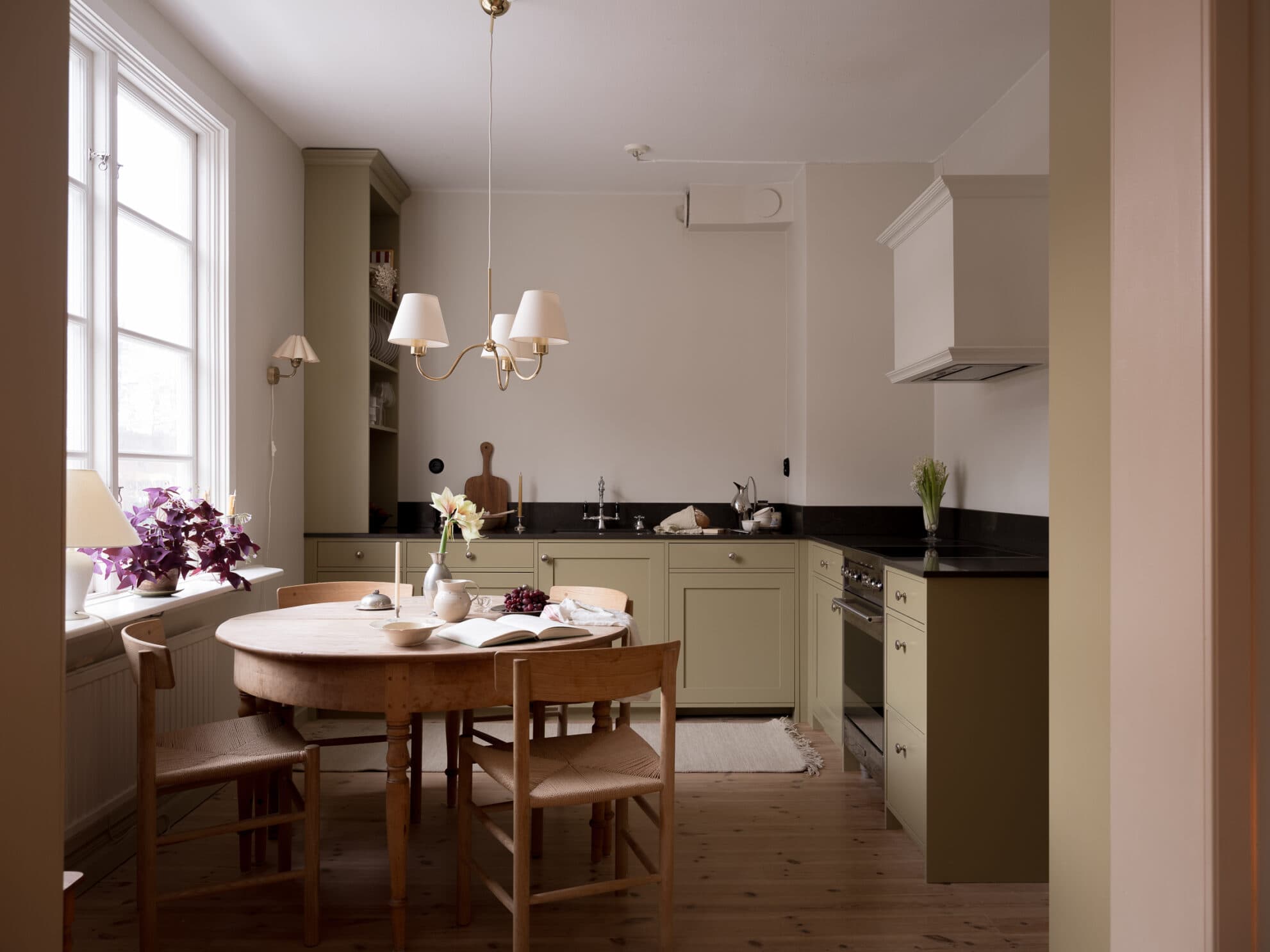 Köket genomgick en totalrenovering under maj-juni 2021, utförd av finsnickare från Lindome för att maximera funktionalitet och design. Den imponerande bänkskivan hämtades från ett stenhuggeri i Angered, medan vattenblandaren och övriga detaljer inhandlades från Byggfabriken. Köksutrustningen består av spis och ugn från Smeg, integrerad och platsbyggd kyl och frys från Ikea, integrerad diskmaskin från Ikea och en spisfläkt med platsbyggd kåpa och Thermax-fläkt. En mindre vägg byggdes under renoveringen för att skapa en optimal uppdelning mellan kök och vardagsrum. Jotuns färg Sans pryder väggarna och harmoniserar med ett vackert massivt furugolv från Norrlandsträ, inlagt våren 2021.