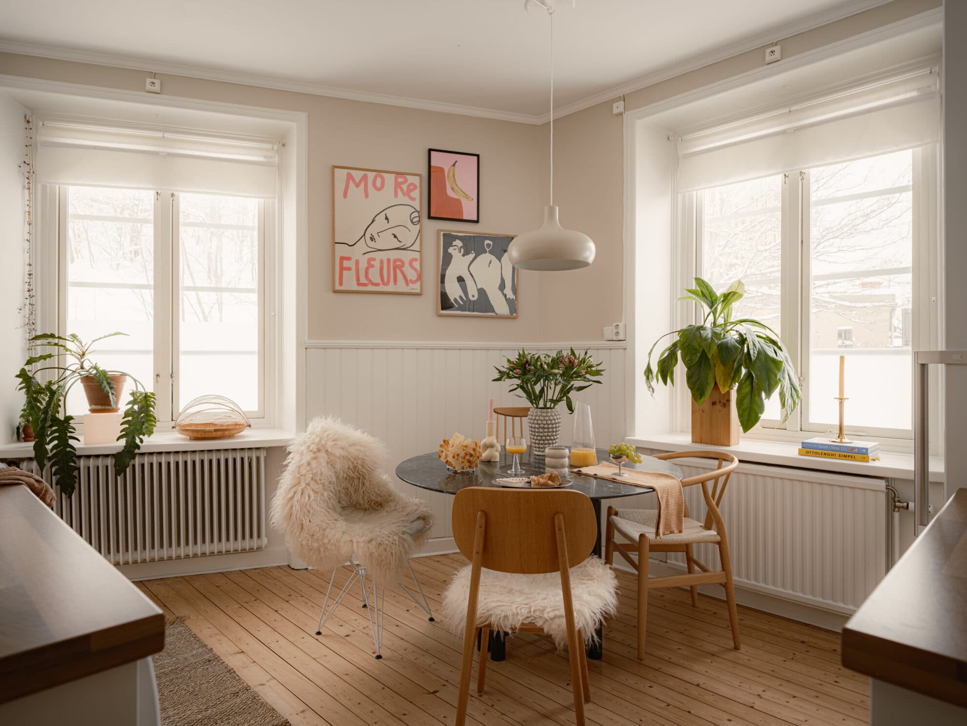 Det charmiga köket i vinkel genomsyras av vackra 20-talsdetaljer såsom pärlspont, gjutjärnselement och djupa fönsternischer. De fina träplankorna på golvet samspelar elegant med den vita bröstpanelen samt väggar i en varm beige ton. Här finns plats för ett matbord för minst fyra personer, och tack vare gavelläget flödar dagsljuset in genom två fönster i olika väderstreck. Köket erbjuder goda arbetsytor och generös förvaring bakom ljusa köksluckor. Den maskinella utrustningen består av spis med ugn, fläkt, kombinerad kyl/frys samt diskmaskin.