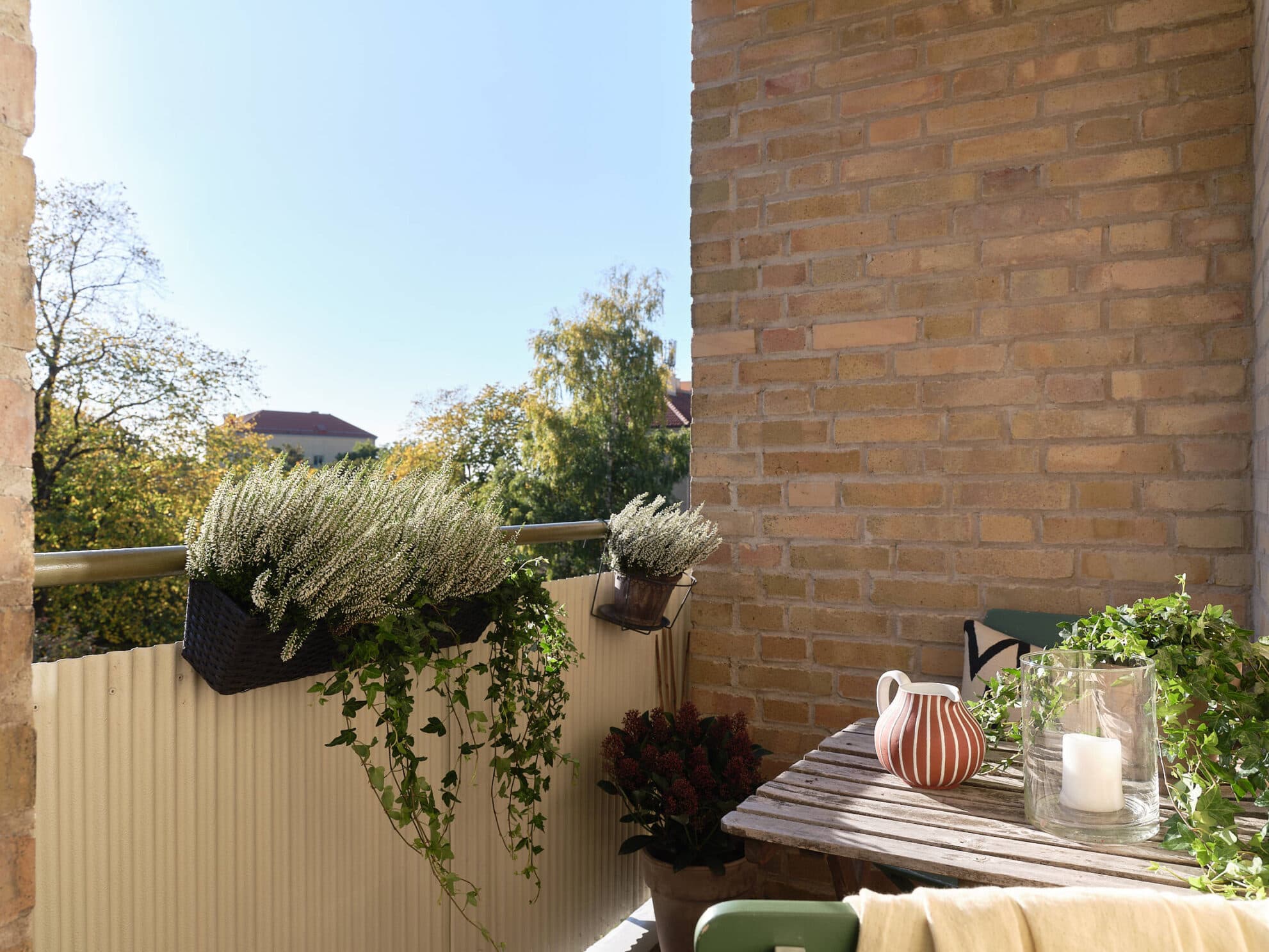 Från vardagsrummet når man även den södervända balkongen. Här sitter man insynsskyddat högt ovan mark och kan njuta av solens strålar från tidig förmiddag tills solen går ner längs med fasaden. Då balkongen är indragen i fasaden så sitter man även väderskyddat och kan njuta av den även under de regnigare dagarna. Storleken tillåter möblering med en loungemöbel eller caféset med tillhörande bord.