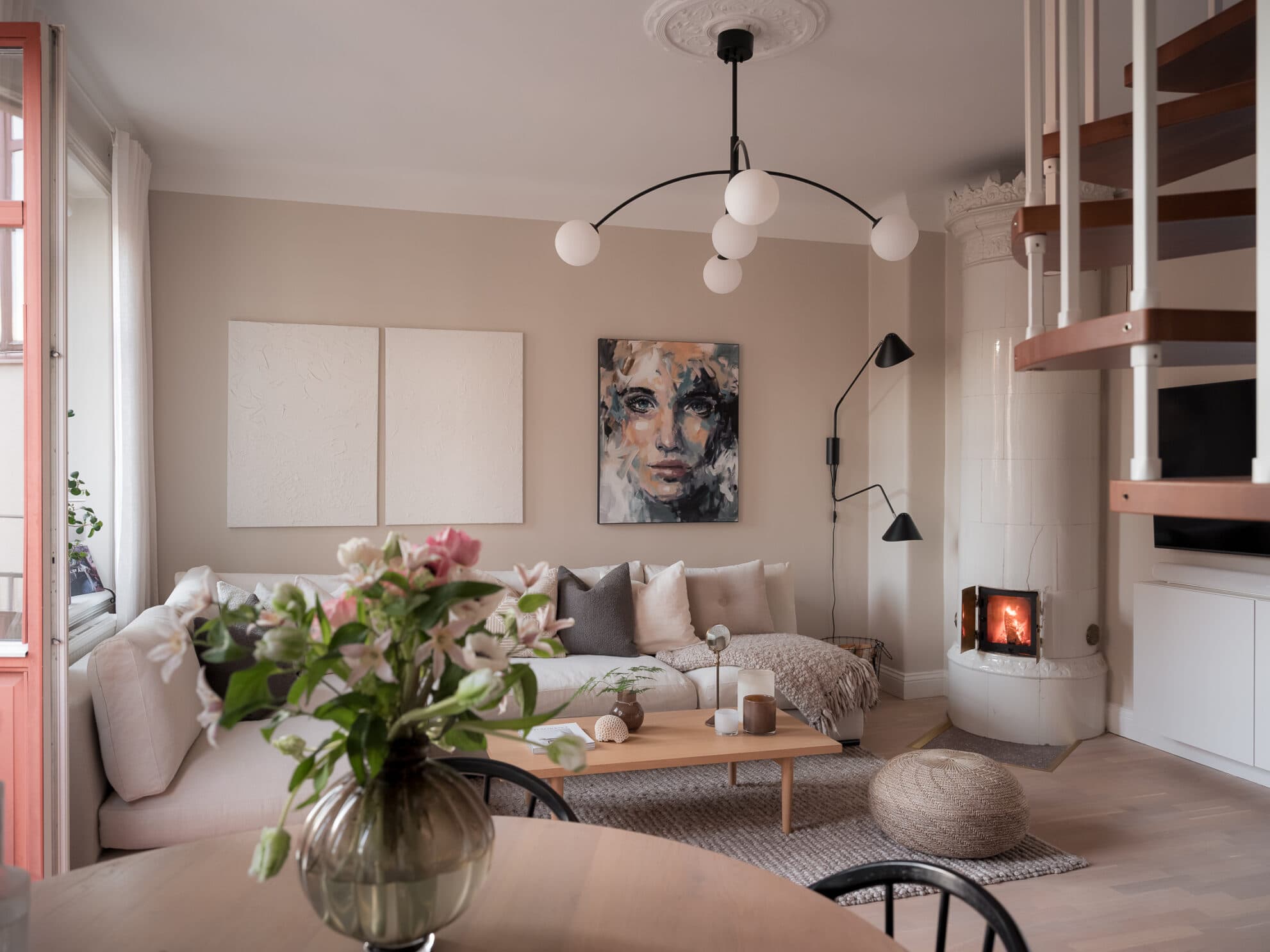 Vardagsrum och kök samspelar i en öppen och luftig planlösning som bjuder in till både vardagsliv och sociala tillställningar. Den laserade ekparketten löper enhetligt genom rummet och väggarna, målade i en varm sandkulör, bildar en elegant kontrast till de vita listerna. Planlösningen är generös och lättmöblerad med gott om plats för både soffgrupp och ett större matsalsbord, perfekt för långa middagar i goda vänners lag. Ljuset flödar in genom höga fönster i djupa nischer och när kvällen sänker sig sprider den eldbara kakelugnen både värme och stämning. Under sommarhalvåret blir den södervända balkongen en naturlig förlängning av bostadens sällskapsytor, med många soltimmar och ett rofyllt gårdsläge mitt i Linné. På våren fylls luften av doften från grannhusets syrener.