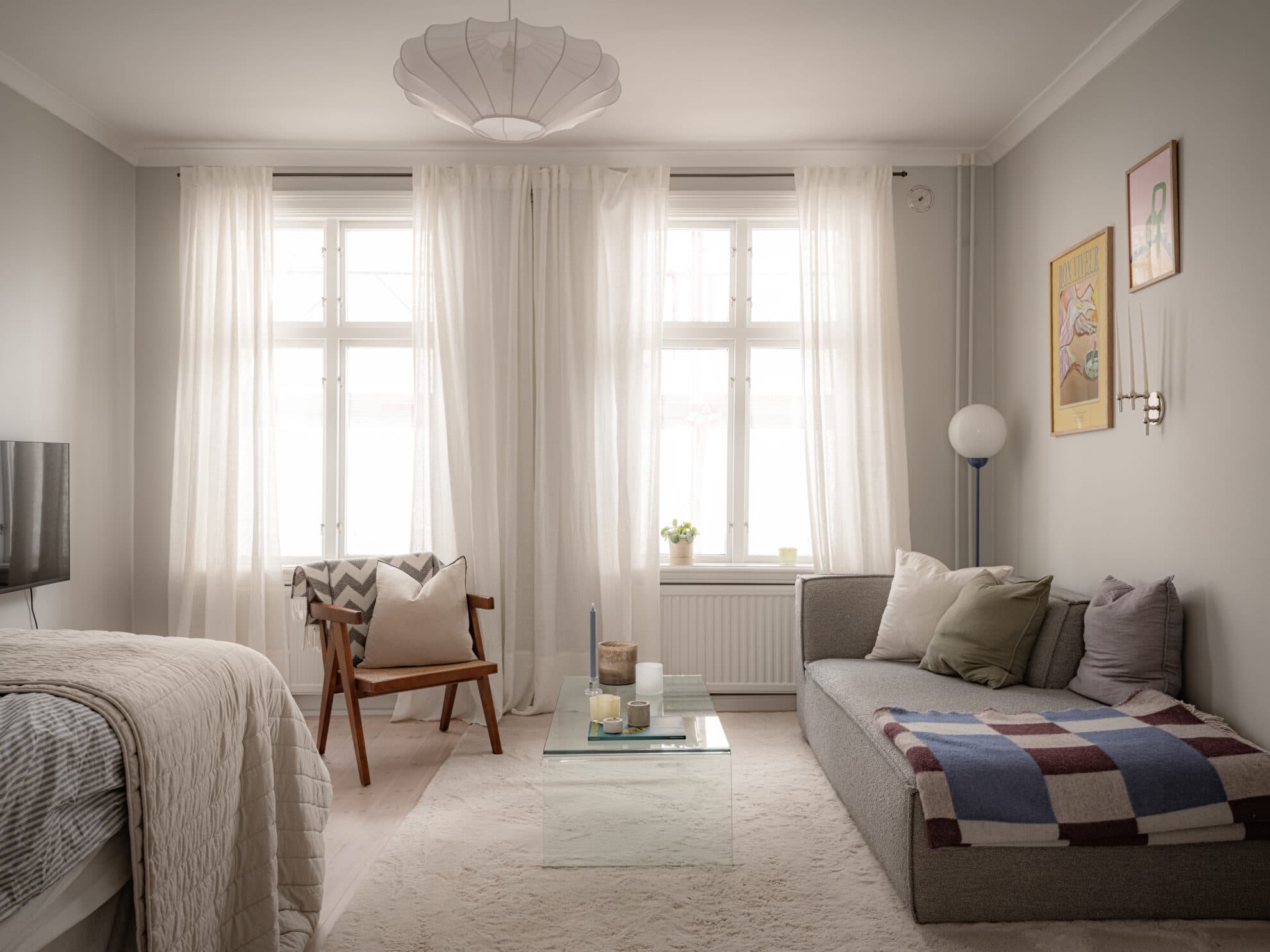 Det rymliga allrummet präglas av två stora fönster med klassisk spröjs upptill och vackra fönsterbrädor i trä. Det generösa ljusinsläppet skapar en ljus och trivsam känsla, som ytterligare förstärks av den öppna planlösningen mot köket. Tack vare fönster i motsatt väderstreck flödar ljuset genom hela rummet. Här finns gott om plats för både en bekväm soffhörna, en sovdel och ett arbetsutrymme.