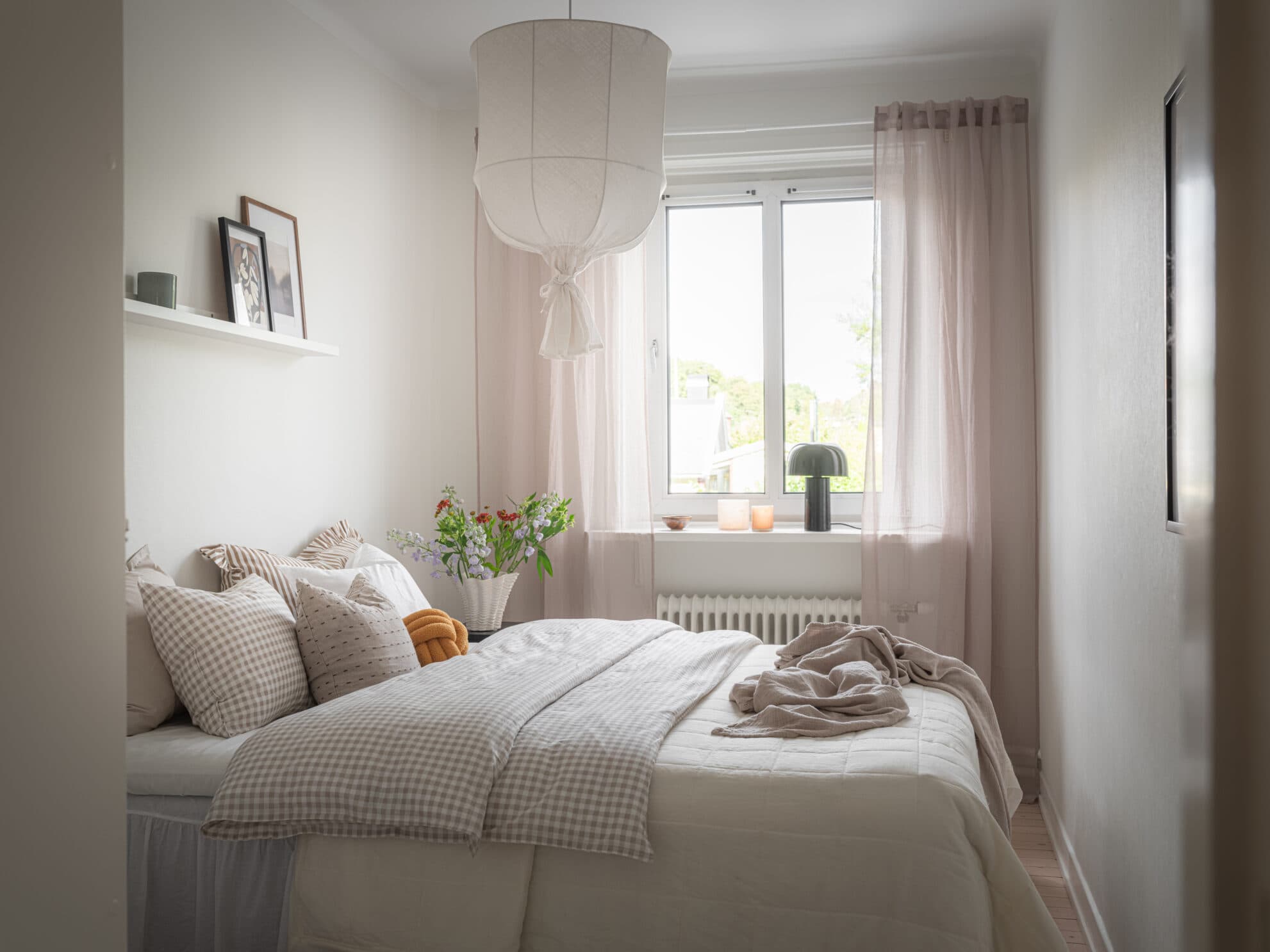 Det mysiga sovrummet har plats för en dubbelsäng, och tack vare det rofyllda läget mot lugna kvarter sover man gott om natten. Här finns två garderober som rymmer mycket förvaring. Brädgolvet är framtaget och väggarna målade i en ljus ton. Även här finns finmejslade listverk, gjutjärnselement och takrosett. Sovrummet ligger bakom glasinfattad innerdörr.