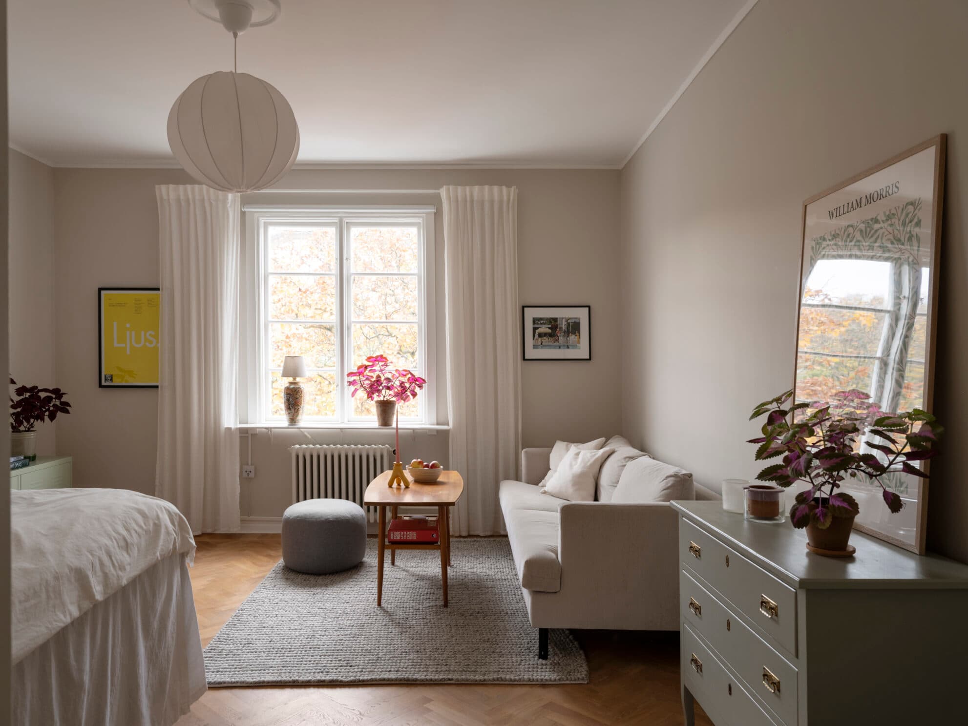 Rummet är rejält tilltaget och kan med bibehållen luftig känsla enkelt möbleras med soffa, TV-bänk, skrivbord och säng. På golvet finner ni en vacker fiskbensparkett och väggarna är målade i ljusgrått.