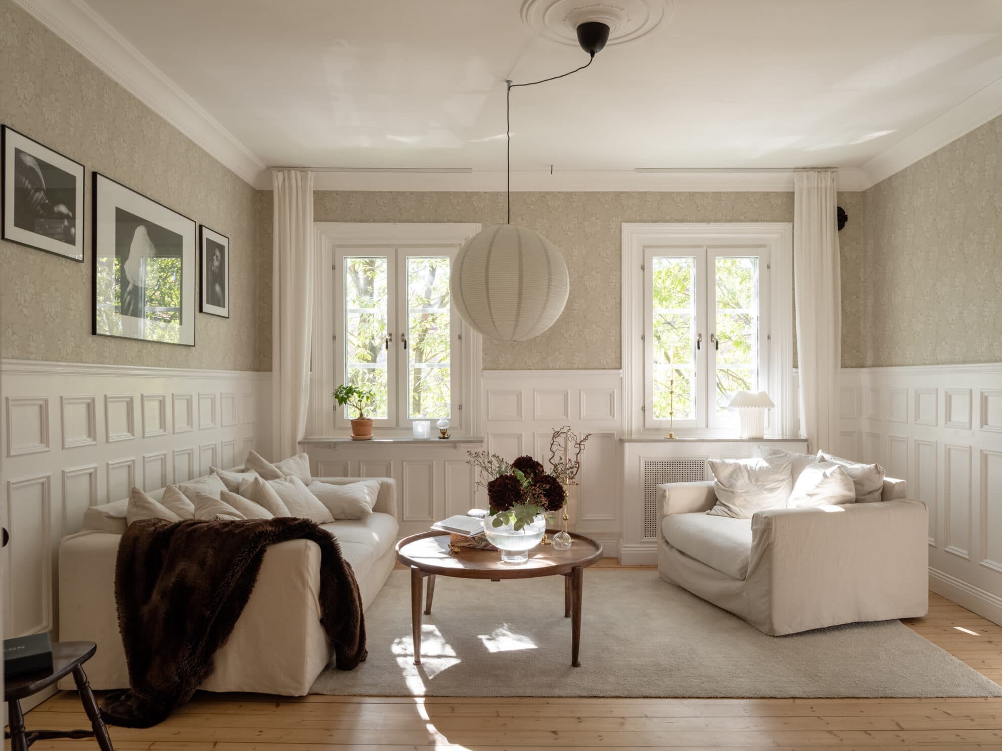 Ett rum som andas tidlös elegans! Väggarna är klädda med en klassisk bröstpanel med ovansittande tapet från Boråstapeter, och brädgolvet fortsätter att sprida sin charm. Originaldetaljer som den vackra stuckaturen och den dekorativa takrosetten i taket för tankarna 100 år tillbaka i tiden. Två fönster släpper in dagsljus och utanför finns vackra träd som gör att rummet blir helt insynsskyddat.