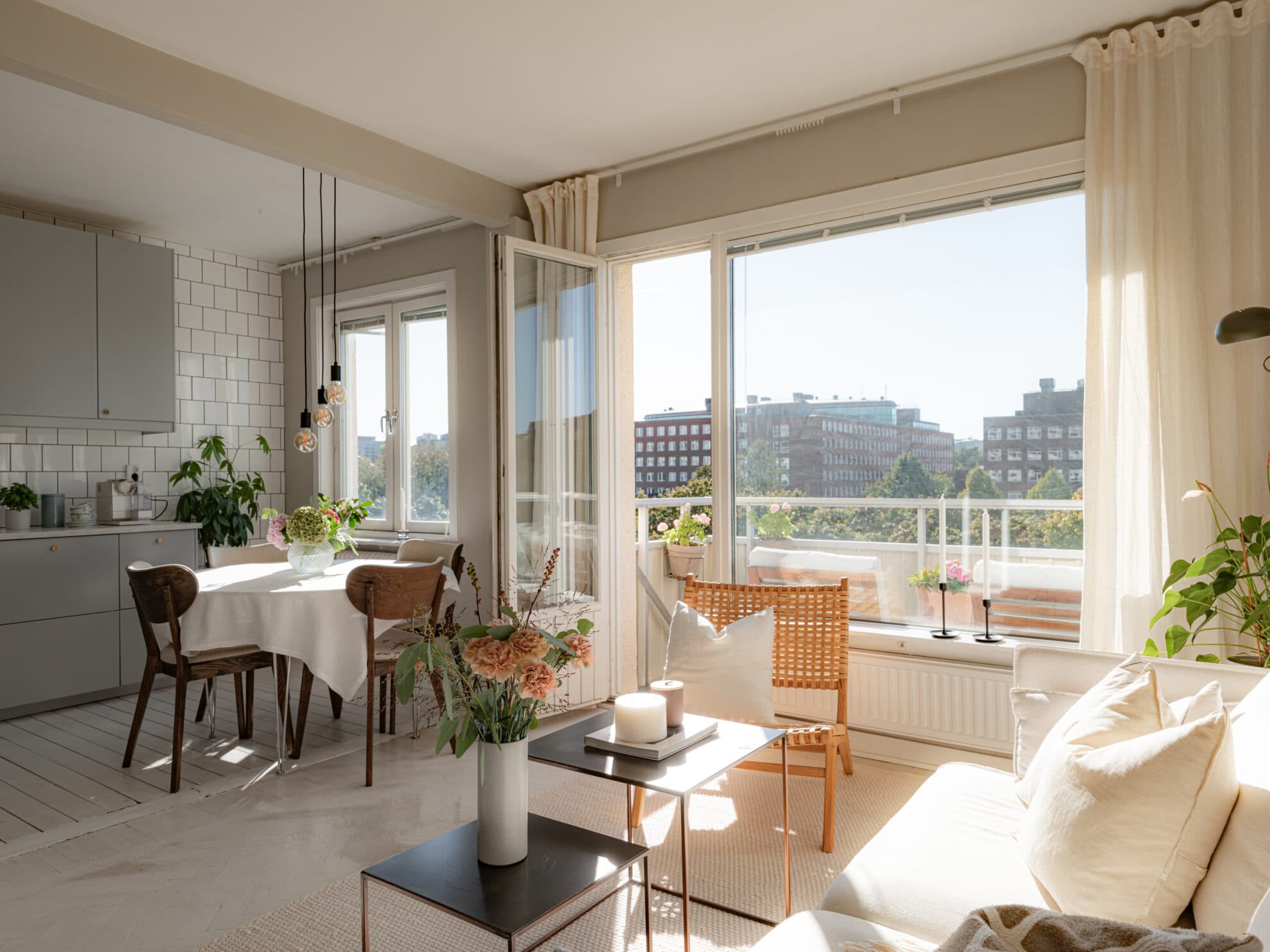 Högt upp i huset väntar en hemtrevlig funkistvåa med solig balkong i perfekt västerläge. Här möts kök och vardagsrum i en öppen planlösning som bjuder in till både vardagsliv och sociala sammanhang. Plankgolvet i köket harmonierar vackert med den vitlaserade fiskbensparketten i vardagsrummet och ger hemmet en stilfull kontrast mellan klassiskt och modernt. De stora fönstren släpper in rikligt med dagsljus, och tack vare det höga läget i huset förstärks känslan av rymd och ljus.