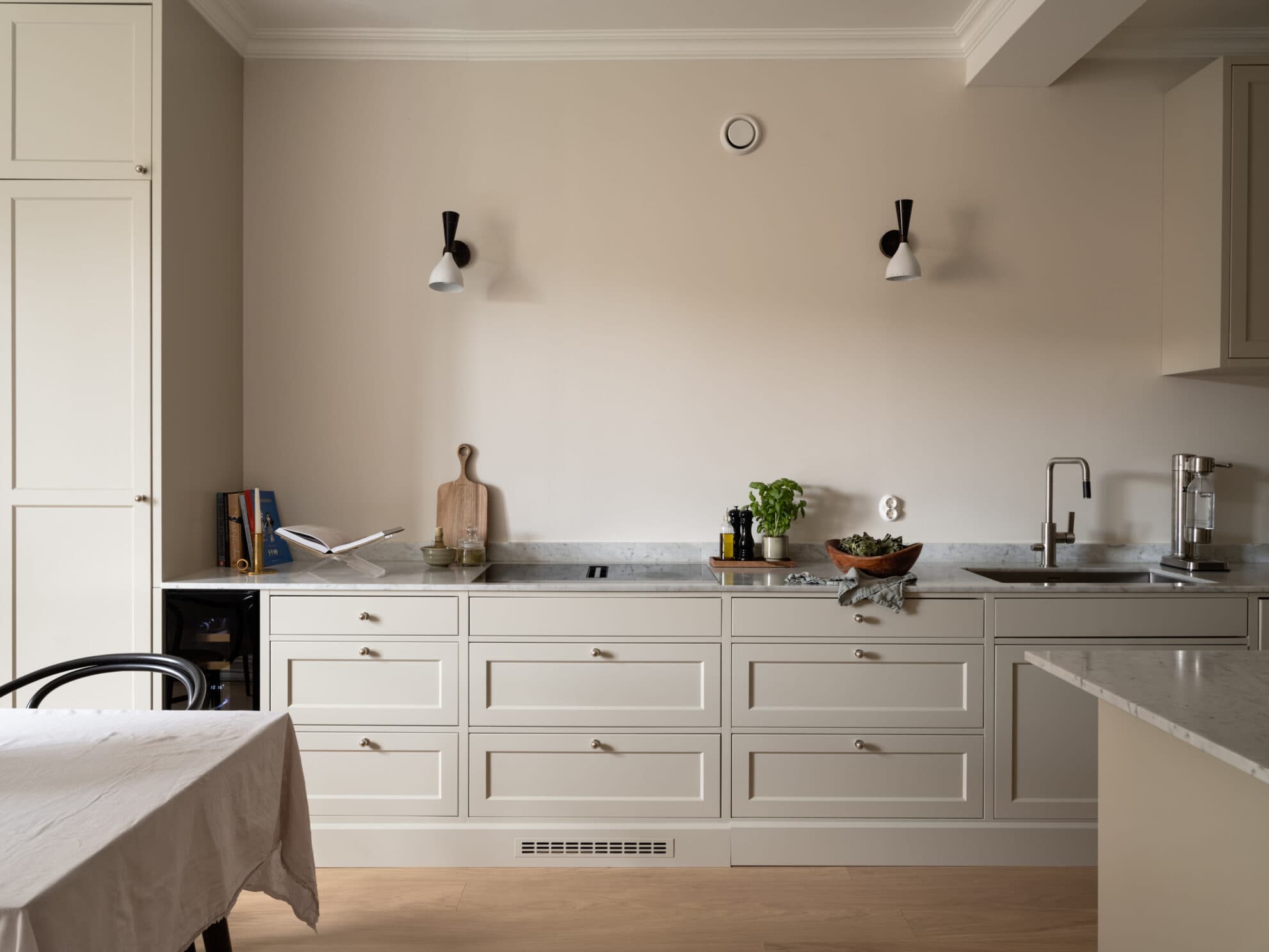 Det nyrenoverade köket från Länghemskök är hemmets självklara hjärta, en plats som bjuder in till både matlagning och umgänge. Här kombineras tidlös design med genomtänkta materialval. Väggarna är målade i den mjuka kulören Lys Antik från Jotun som harmonierar fint med det härdade ekgolvet, medan bänkskivor i marmor adderar elegans och karaktär. Den generösa takhöjden om cirka 2,9 meter förstärker känslan av rymd. Arbetsytorna är väl tilltagna och förvaringen generös, något som gör köket både vackert och funktionellt. Vitvarorna är från Siemens och kyl/frys från Electrolux, och för extra bekvämlighet finns även diskmaskin.