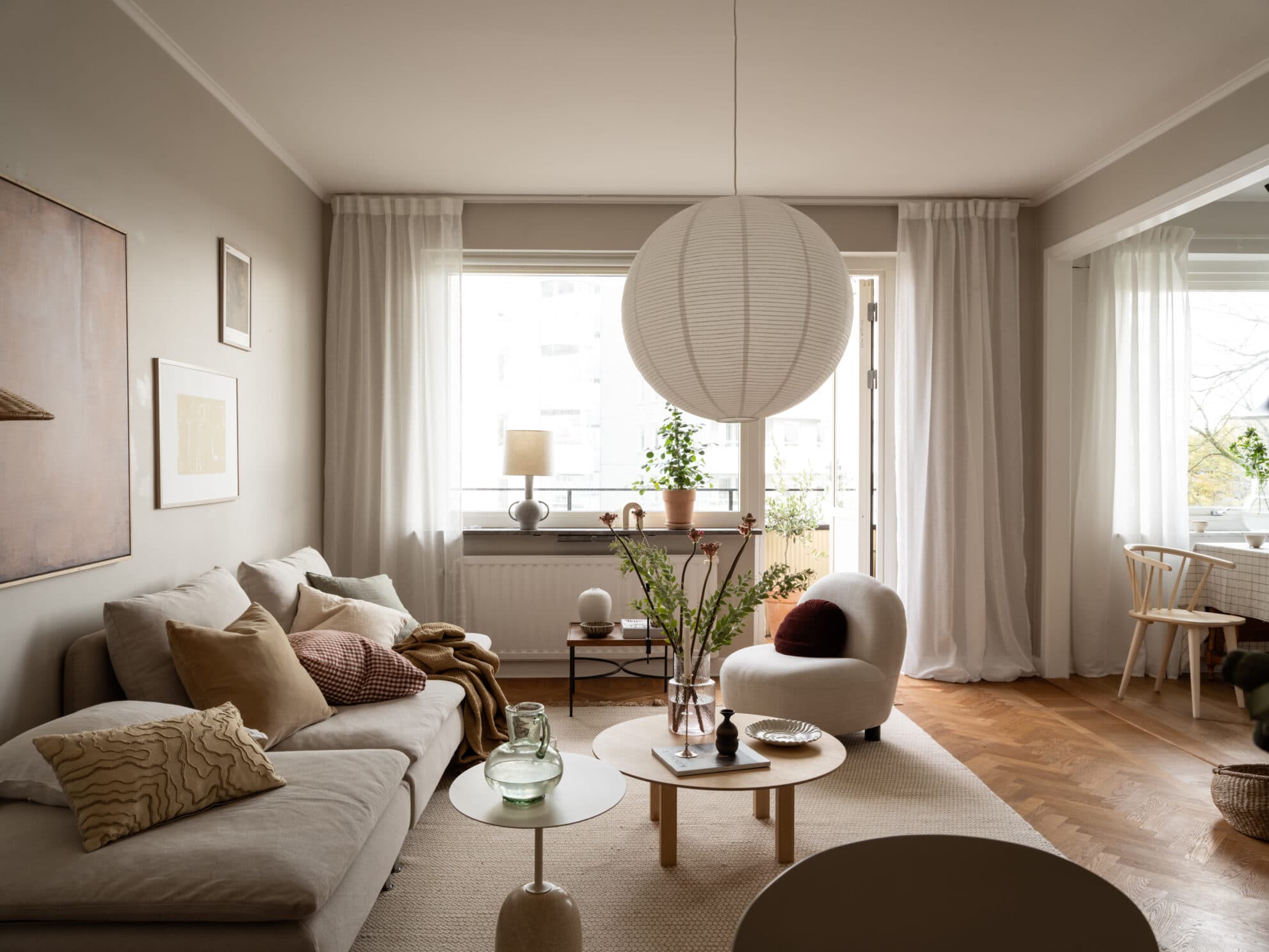 Rymligt vardagsrum med generös takhöjd och vacker fiskbensparkett som ger rummet både värme och karaktär. Den öppna planlösningen mot köket skapar en social och ljus atmosfär, perfekt för både vardag och fest. Från vardagsrummet når man balkongen i sydostläge, där morgonsolen strålar in och förlänger vardagsrummet under sommarhalvåret. En plats som förenar stil, ljus och charm på ett alldeles speciellt sätt.