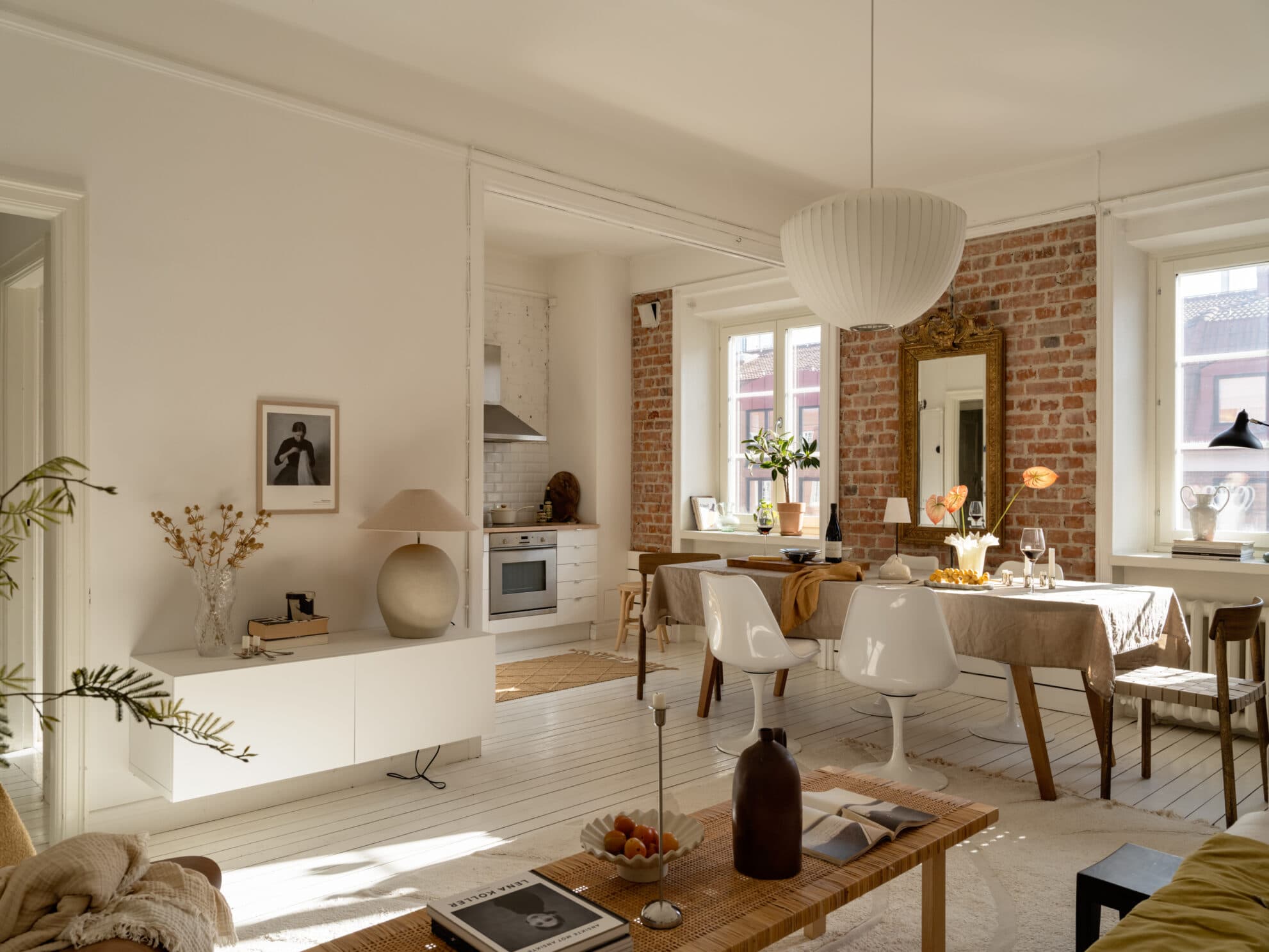 Det stora vardagsrummet bjuder på en härlig känsla av rymd med sin generösa takhöjd och öppna planlösning mot köket. De vitmålade plankgolven löper genom rummet och samspelar med väggarnas ljusa ton, vilket låter ljuset dansa fritt mellan ytorna. Här finns gott om plats för en större matgrupp där vänner och familj gärna samlas till långa middagar. Den framknackade tegelväggen tillför karaktär och historia, en vacker kontrast mot det moderna uttrycket i övrigt.