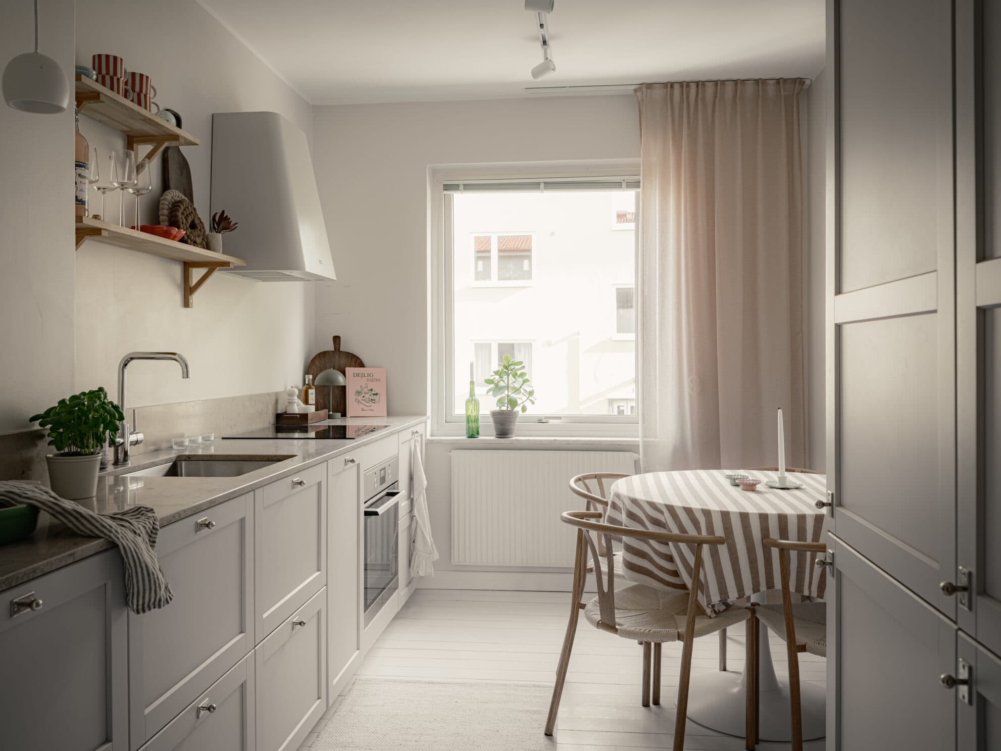 Köket är smakfullt renoverat i ljusa toner med släta skåpsluckor, en vacker bänkskiva i kalksten och gott om arbetsyta och smart förvaring – en perfekt plats för den som uppskattar både funktion och estetik. Vid fönstret finns en trevlig matplats för upp till fyra personer. Även här återfinns det charmiga brädgolvet.