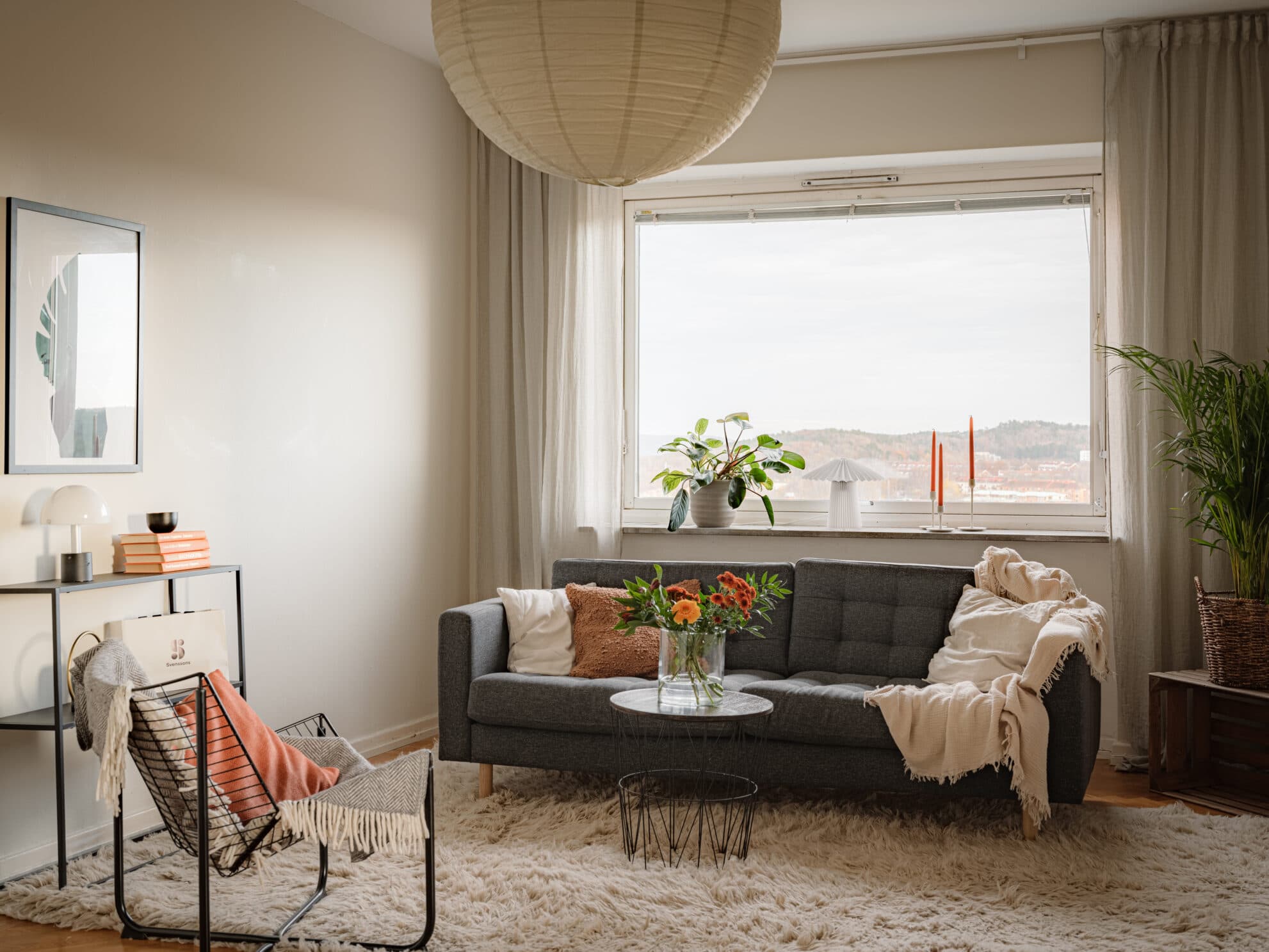 Vardagsrummet är rymligt med gott om plats för en stor soffgrupp och tv-möbel. Här flödar ljuset in tack vare det stora fönstret med utsikt över takåsarna som blir som en vacker tavla som ändrar sig med varje årstid. Golvet är belagt med en vacker fiskbensparkett som enhetligt löper genom hall, vardagsrum/matsalsdel och sovrum.