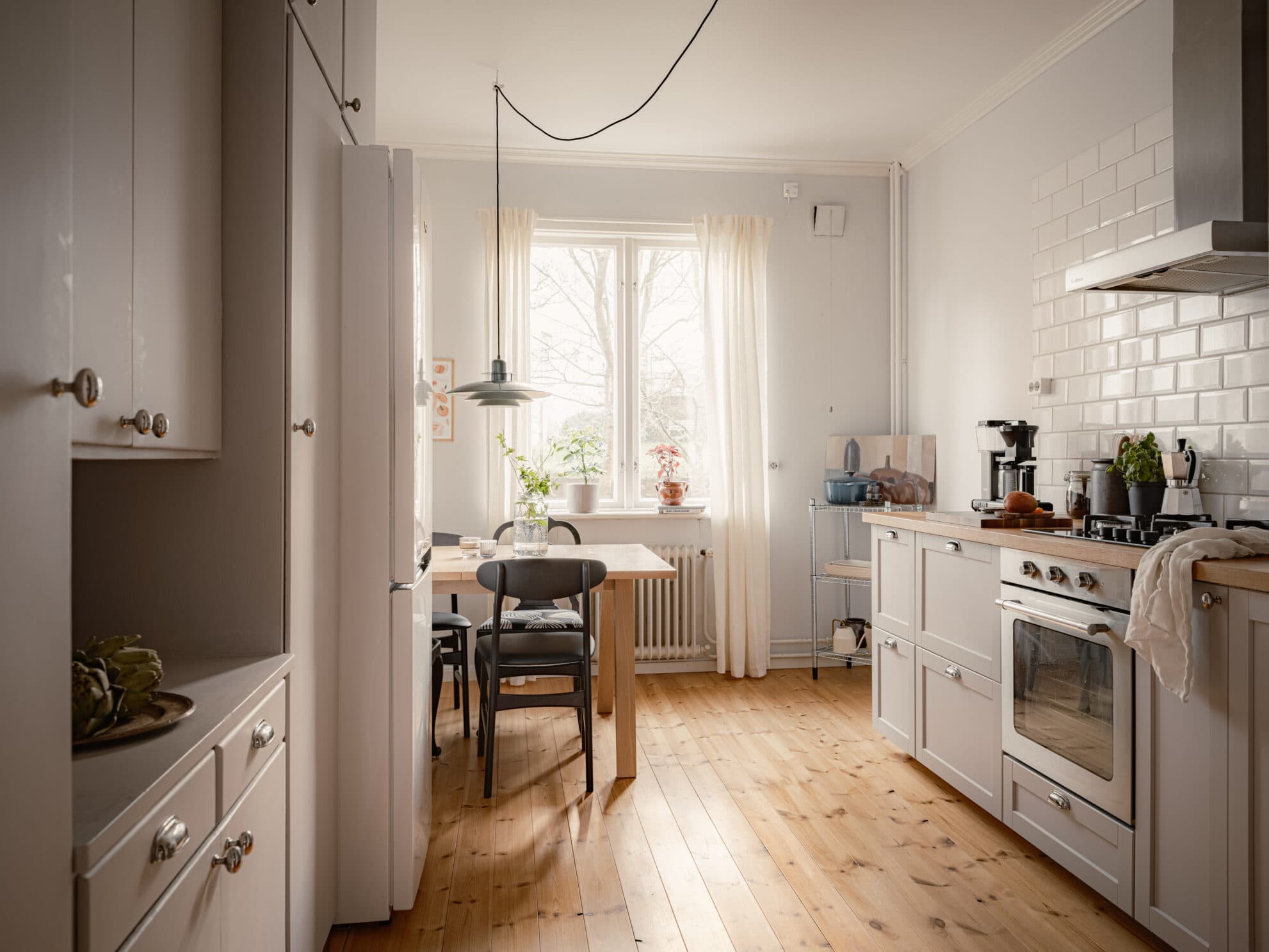 Ett trivsamt och funktionellt kök med gott om arbetsyta och förvaring. De ljusa skåpsluckorna tillsammans med bänkskiva i trä och klassiskt kakel ger ett stilrent och tidlöst uttryck. Här finns plats för matbord vid fönstret där dagsljuset skapar en naturlig samlingspunkt för både vardag och helg.