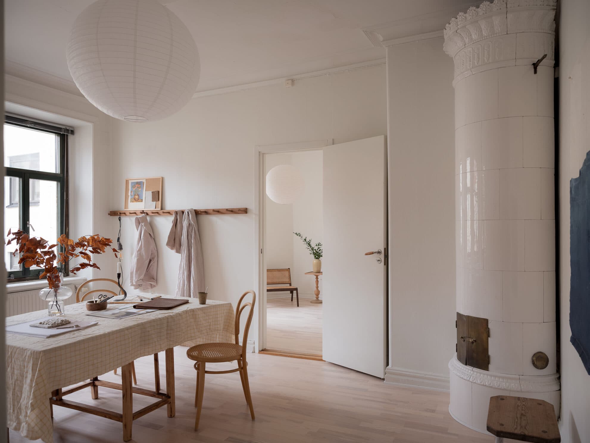 Luftigt vardagsrum med ett härligt ljusinsläpp från två stora fönster. Lägenheten vetter mot en lugn innergård, vilket gör att det är helt tyst och rofyllt. Rummet är lättmöblerat och erbjuder gott om plats för både soffa, TV-bänk och en mysig bibliotekshörna intill den charmiga kakelugnen.