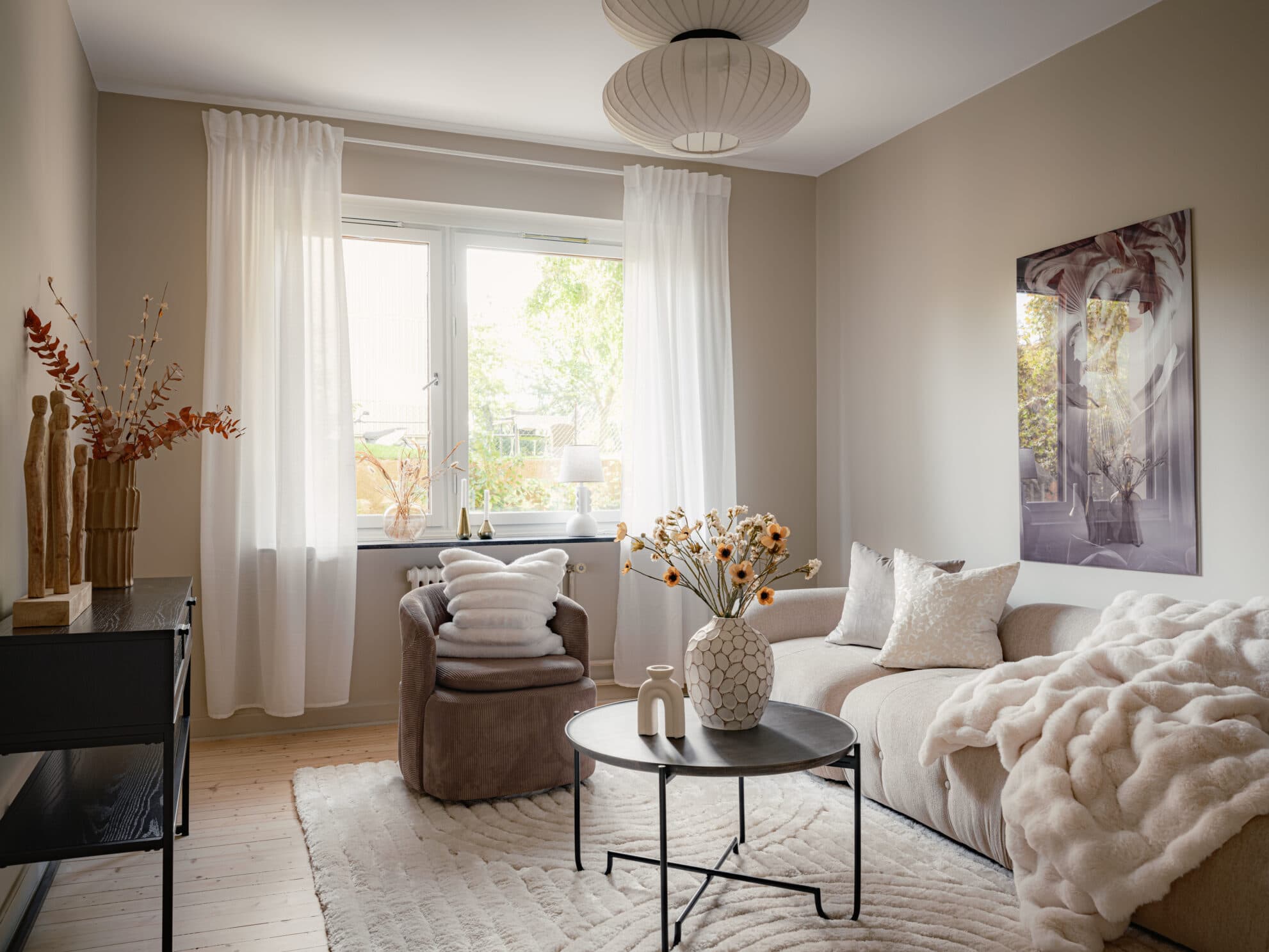 Ett härligt rum med stora fönster som släpper in rikligt med ljus. Vardagsrummet bjuder på gott om yta för både soffgrupp och läshörna. Ljusa väggar, vackra trägolv och naturliga materialval skapar en varm och inbjudande atmosfär. Härifrån har du utsikt mot grönska och rofyllda omgivningar.