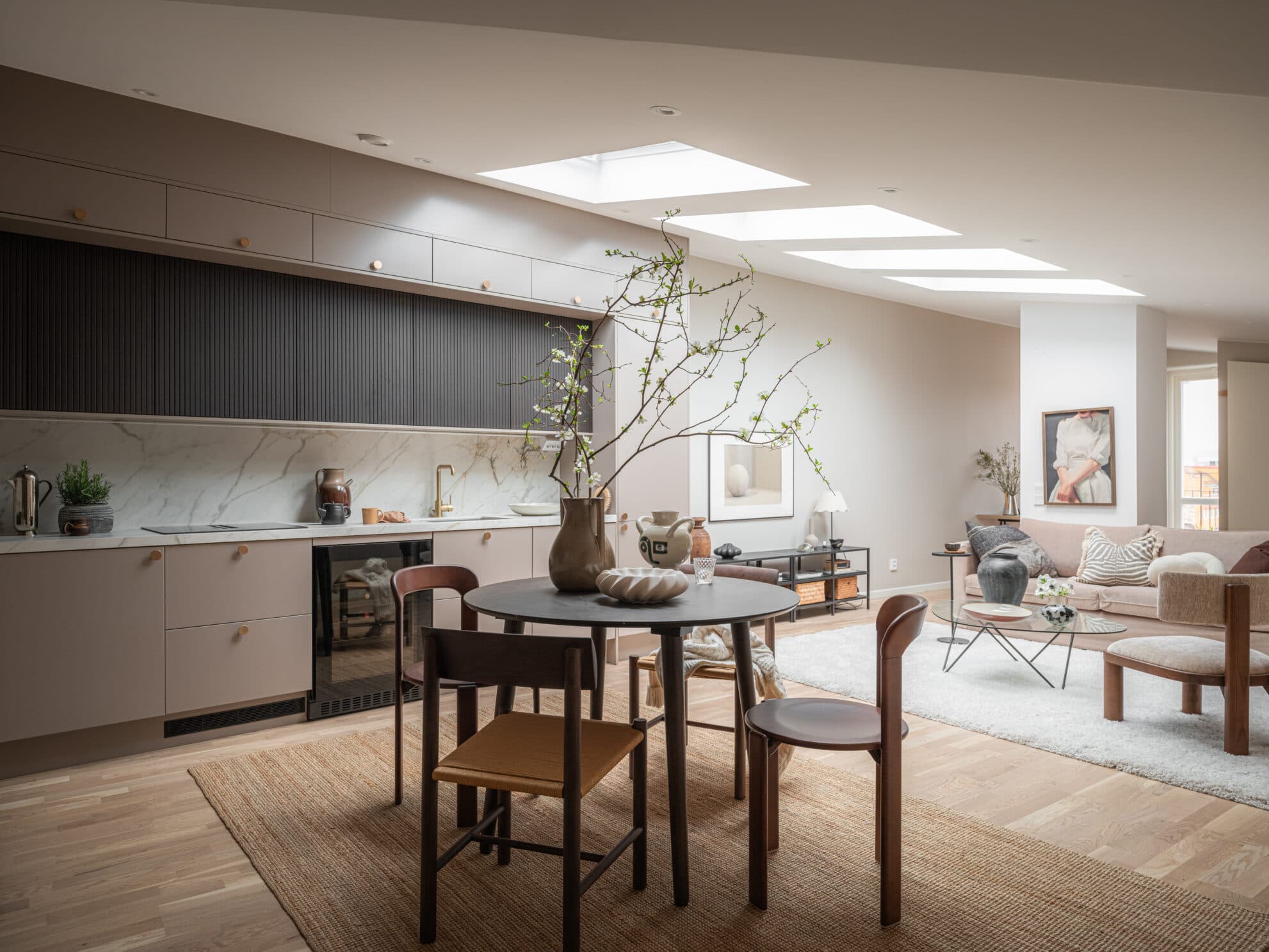 Lägenhetens vardagsrum och kök är i enhet i en öppen planlösning med fantastiskt ljusinsläpp från stora fönster och takfönster. Utsikten är hänförande och man kan se flera av innerstadens kända landmärken som Skansen Kronan och Ullevi över områdets takåsar från balkongen. Tack vare det nästan raka söderläget njuter badar man i sol under hela dagen. Vardagsrummet är generöst tilltaget och har gott om utrymme för både soffgrupp och matsalsbord. Halvrummet närmast balkongen passar perfekt som kontor och förvaring eller kan delas av som barnrum/gästrum.
