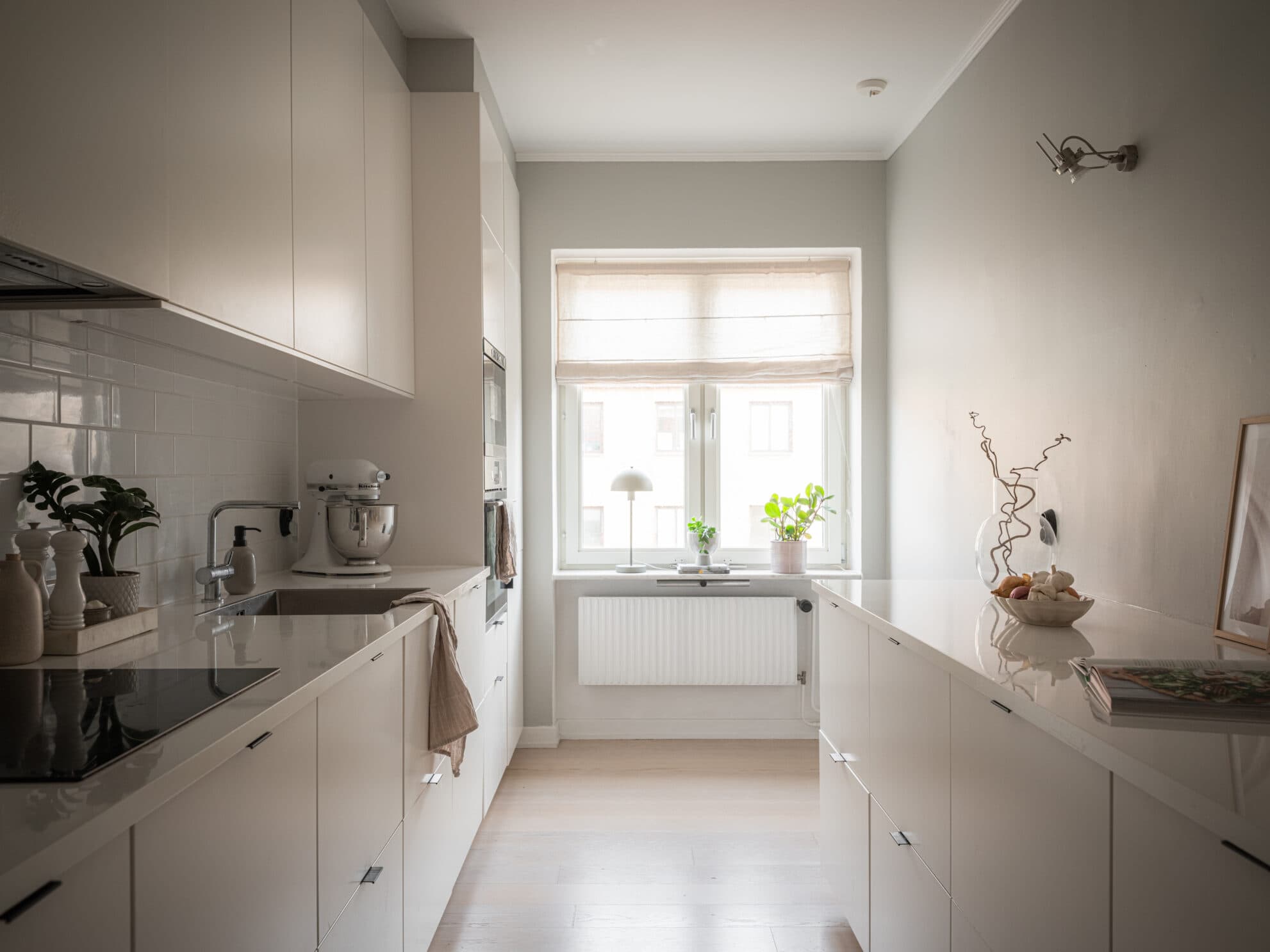 Köket är lika snyggt som det är välplanerat. Det är rejält tilltaget med både arbetsyta och förvaring, och tack vare parallella bänkar kan hemmakockarna laga mat tillsammans utan att behöva trängas. Skåpen har vita släta luckor och lådor med stilrena handtag, och bänkskivorna är i vit högglansigt laminat. Partiet ovanför arbetsbänken, med infälld diskho och spishäll, är klätt med vitt blankt Höganäskakel i halvförband med vit fog. Ugnen och mikron är i rostfri design medan kylen/frysen och diskmaskinen är integrerade i inredningen. Fläkten döljs i ett överskåp. Köket har kulören Greige på väggar och golvet är belagt med enstavsparkett i vitlaserad ek. Liksom övriga lägenheten har köket ett härligt ljusinsläpp, och vid fönstret finns plats för en mysig matplats för de mindre måltiderna. Det spröjsade fönstret vid öppningen mot hallen sattes in i samband med renoveringen och är en smakfull detalj.
