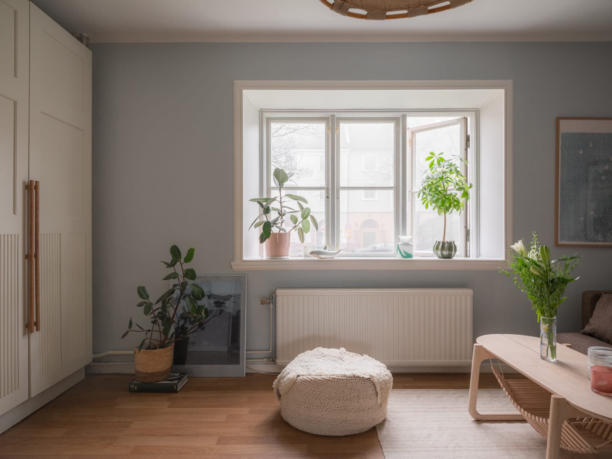 Ett brett treluftsfönster mot Mariagatan fyller vardagsrummet med ljus samtidigt som det, tillsammans med takhöjden, skapar en härligt luftig atmosfär. Rummet är lättmöblerat, och det finns gott om plats för en stor soffgrupp samt matbord. Utmärkt förvaring erbjuds i form av rejäl garderobsvägg med vackra fronter.