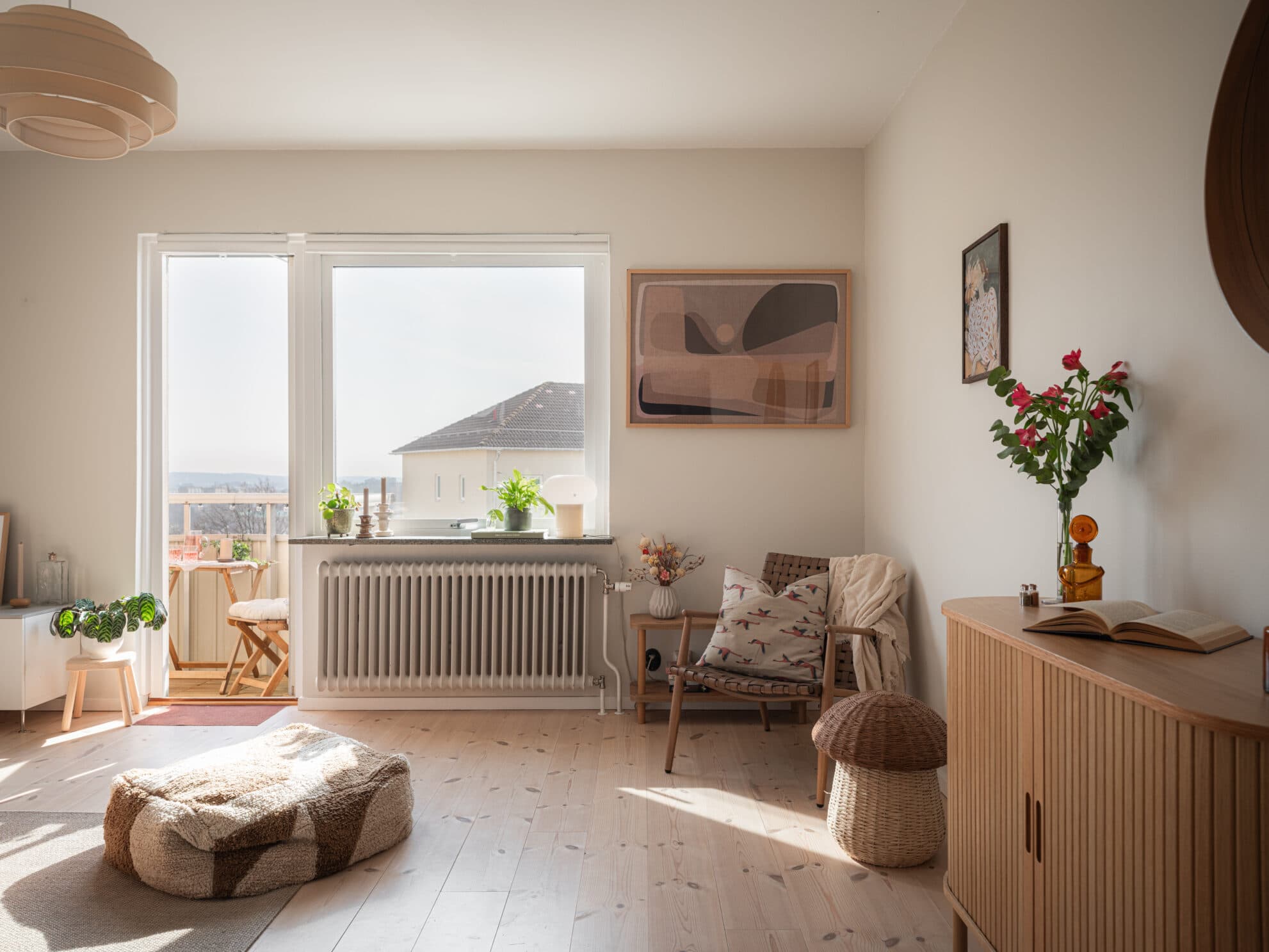 Vardagsrummet har utgång till en balkong som vetter i söderläge och har fantastisk utsikt mellan grannhusen och över Kundsladugårds takåsar och hela vägen till Högsbo. Balkongen blir som ett extra rum under sommarhalvåret, här njuter man av lugnet bland de lummiga trädkronorna utanför huset och sol större delen av dagen.