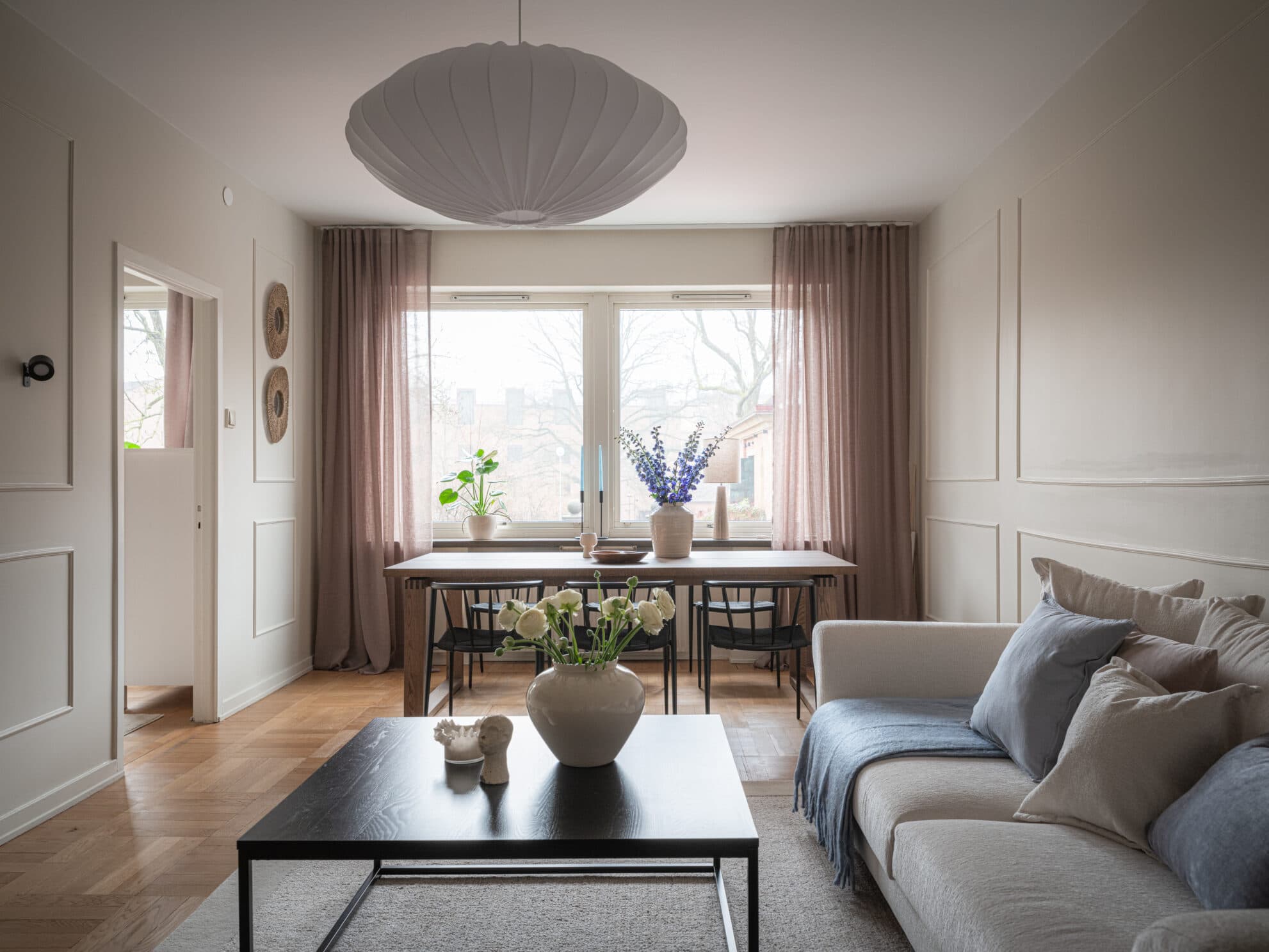 Lägenhetens vardagsrum är generöst i sin utformning och enkelt att möblera efter behov. Här ryms med lätthet såväl soffgrupp och TV-bänk som matsalsbord och skrivbord – utan att den luftiga känslan går förlorad. Flera fönster släpper in ett härligt ljusflöde som lyfter rummet ytterligare. Väggarna är nymålade i en varm sandkulör som skapar en mjuk inramning, och golvet pryds av bevarad originalparkett i vackert holländskt förband.