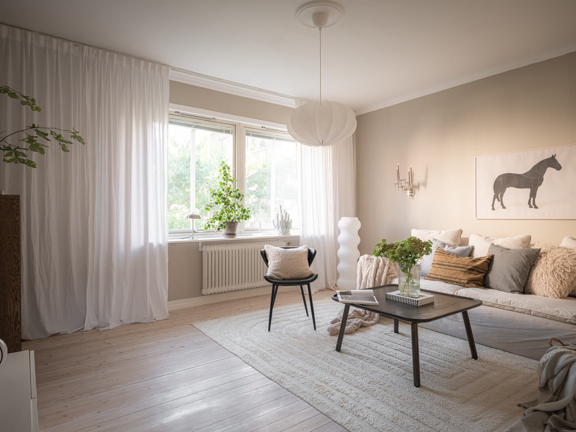 Vidare in i lägenheten öppnar vardagsrummet upp sig – ett luftigt och inbjudande rum med ca 2,7 meter i takhöjd, nymålade väggar i den harmoniska nyansen Sand från Jotun och generösa fönsterpartier med grönskande utsikt som släpper in dagsljus i överflöd. Här finns gott om plats för både socialt umgänge och avkoppling då både matsalsbord och soffgrupp inryms.