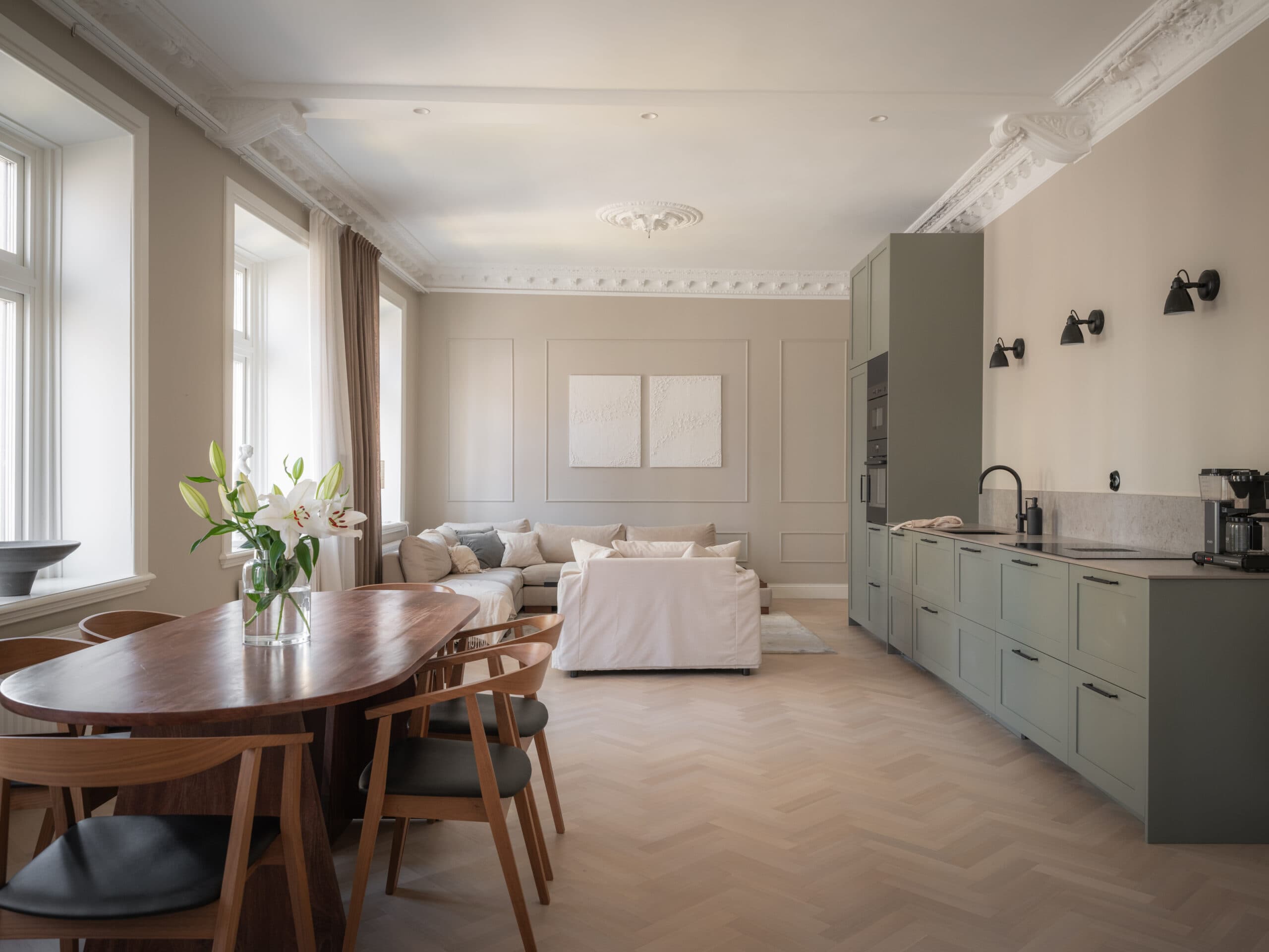 Ett luftigt och öppet rum där kök och vardagsrum samspelar på bästa sätt. Köket är smakfullt renoverat med tidlösa materialval, goda arbetsytor och integrerade vitvaror. Den öppna planlösningen gör att du enkelt kan umgås med familj och gäster under matlagningen. Här finns plats för en större matgrupp samt en generös soffhörna för mysiga kvällar. Stora fönster släpper in rikligt med ljus och rummet ramas in av vackra originaldetaljer som takstuckatur och dekorlister.