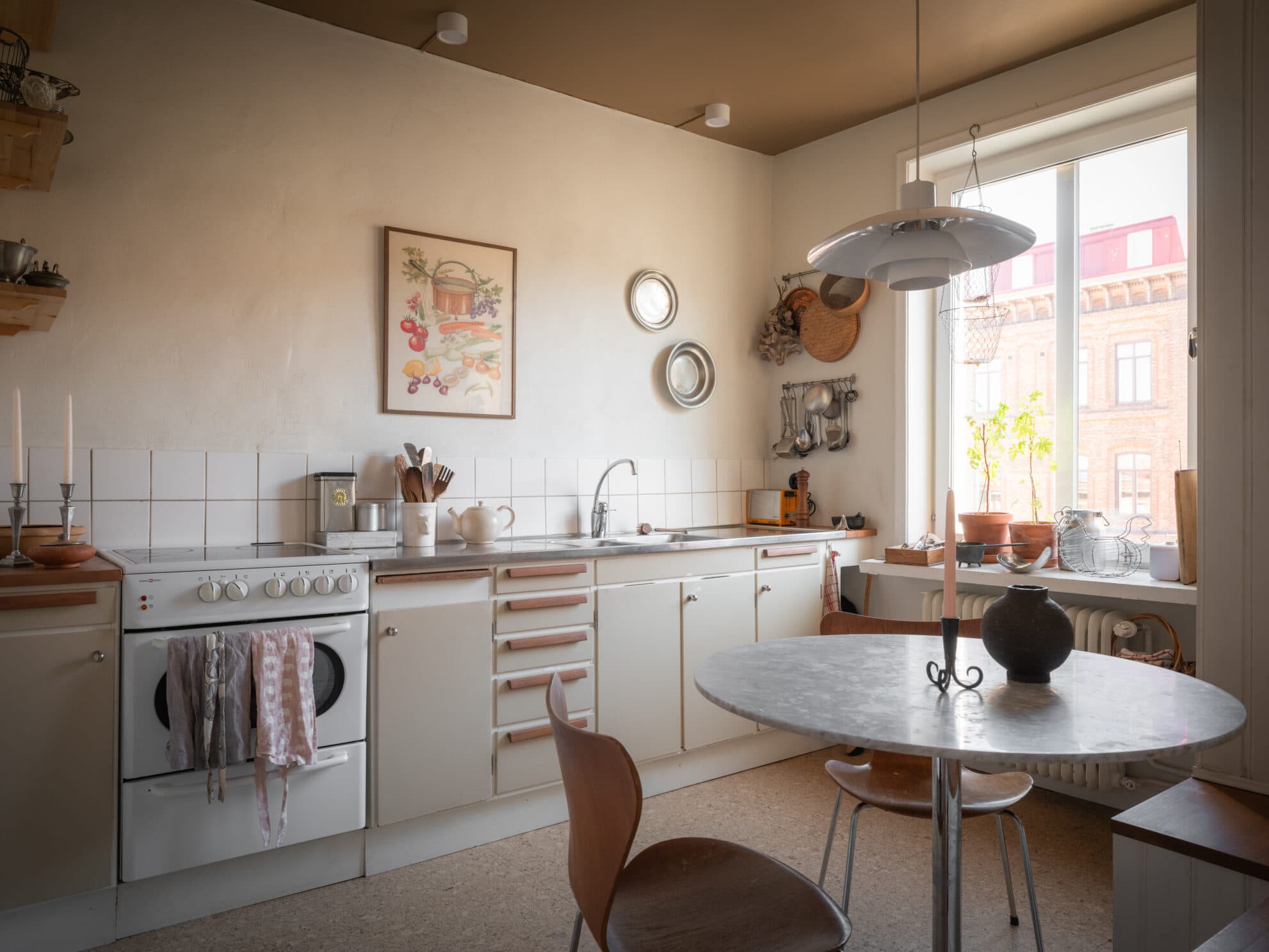 Lägenhetens kök är även detta en trivsam plats, inte minst för hemmakocken. Det finns gott om svängrum och det går med lätthet att bjuda in till middag för fyra. Köksinredningen går i beige, och kaklet över den rostfria arbetsbänken går i vitt. Mot motsatt vägg står kyl och frys, men här erbjuds också ytterligare förvaring av ett skåp. Här går du på ett ljust linoleumgolv, vilket i ljuset från det stora fönstret kontrasteras fint mot det i övrigt ljusa köket.