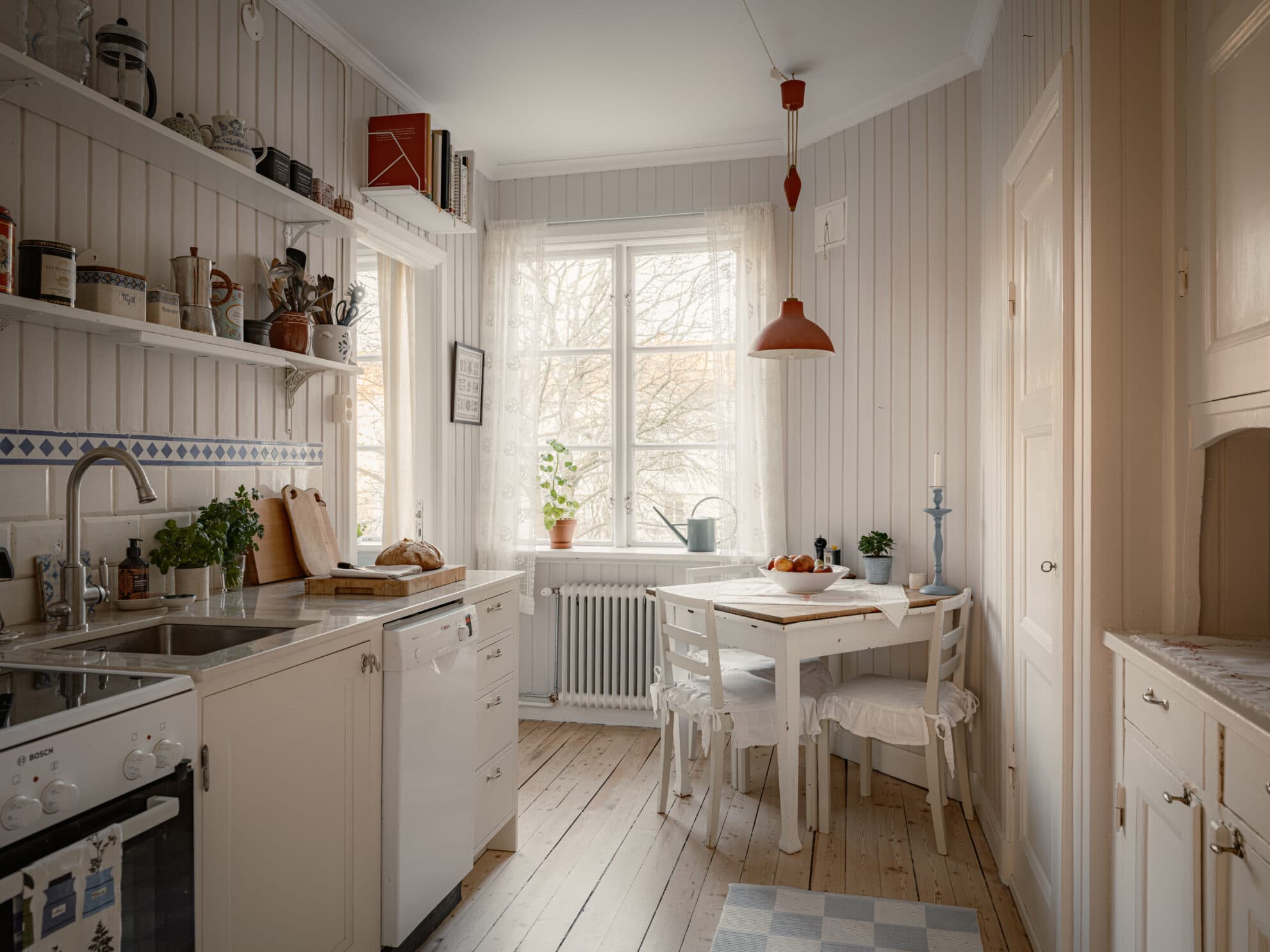 Charmigt så det förslår med pärlspontsbeklädda väggar och bevarad skåpsinteriör. Även skafferiet och serveringsskåpet i tjugotalsutförande står kvar i gott skick. Vid fönstret finns det plats för ett matbord. Köket är utrustat med spis, diskmaskin och köksbänken är i kvartsit med infälld diskho. Ovanför bänken finner ni bevarade kakelplattor. Det är även väl tilltaget med förvaring och skåpen har vita luckor och lådor. Det ursprungliga brädgolvet är framtaget och slipat samt oljevaxat.