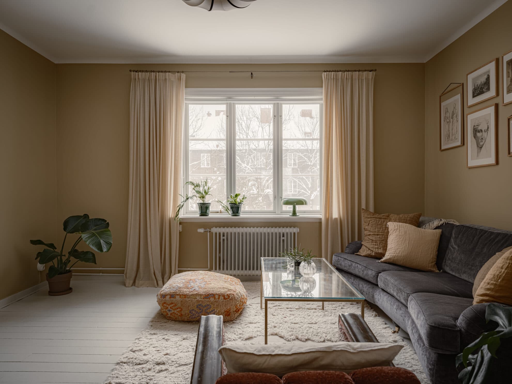 Sovrummet präglas av ett rofyllt ljusinsläpp och en varm senapsgul kulör på väggarna. Även här återkommer de charmiga mässingsdetaljerna ifrån byggfabriken som förstärker bostadens tidstypiska uttryck. Rummet rymmer med lätthet en större säng samt garderobsförvaring. Även här njuter du av en lummig utsikt med väldigt lite insyn.