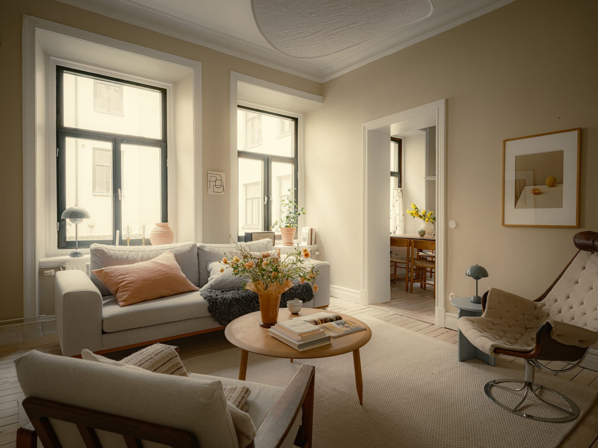 Vardagsrummet välkomnar med en härlig rymd och en atmosfär som direkt känns både inbjudande och karaktärsfull. Den generösa takhöjden samspelar med djupa fönsternischer och vackert bevarade originaldetaljer såsom stuckatur, listverk, kakelugn och tidstypisk takrosett. Tillsammans skapar de en miljö där historiens charm möter ett levande och trivsamt hem. Det framtagna brädgolvet bidrar med värme och karaktär, medan ljuset från fönstren flödar in och förstärker rummets öppna och harmoniska känsla. Här ryms både stillsamma stunder och sociala tillfällen i en miljö som bjuder in till umgänge.