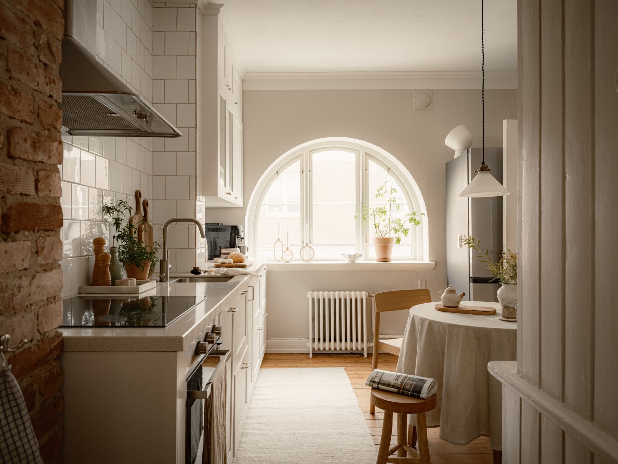 I detta kök möts en perfekt blandning av 20-talets charm med modern stil och funktion. Bänkskivan i kompositsten ger både stil och tålighet, och moderna bekvämligheter som diskmaskin och induktionshäll finns på plats. I samband med renoveringen 2021 plockades en del av murstocken fram, vilket adderar karaktär och värme. Förvaringsmöjligheterna är generösa med både skåp och ett bevarat serveringsskåp i original. Ett mindre matbord för 2–4 personer får gott om utrymme, och dagsljuset flödar in genom det välvda originalfönstret med handblåsta glasrutor som blir som ett konstverk i sig.