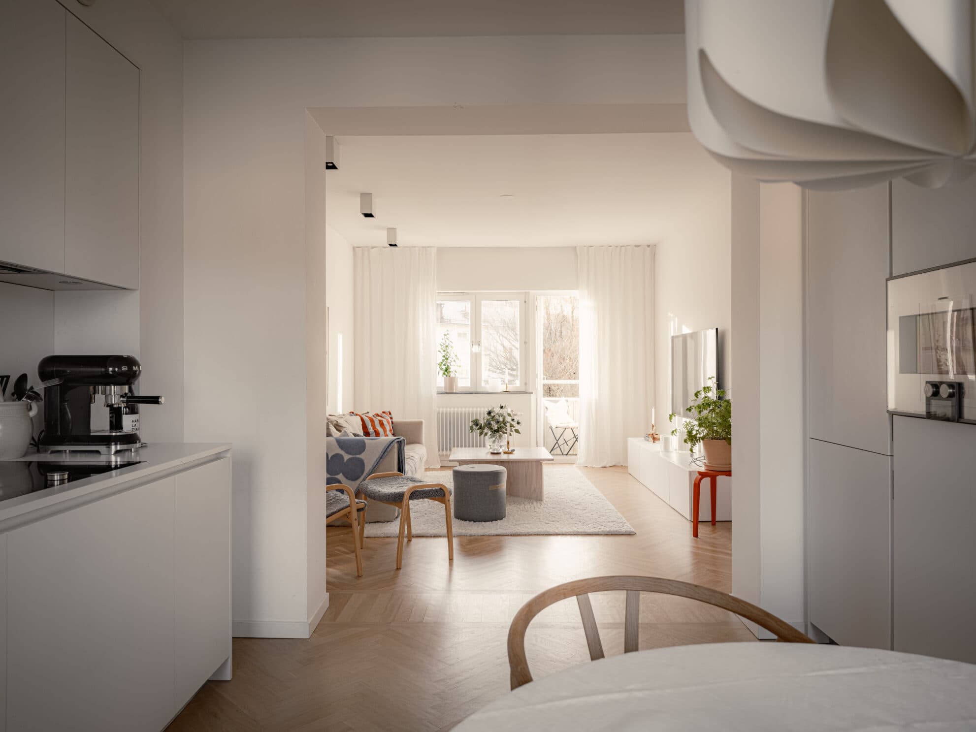Hallen är ljus och med mycket god förvaring i form av platsbyggda garderober som diskret smälter in i väggen. På golvet ligger en ekstavsparkett i original som har slipats och oljats och möter det övriga golvet i samma nyans.