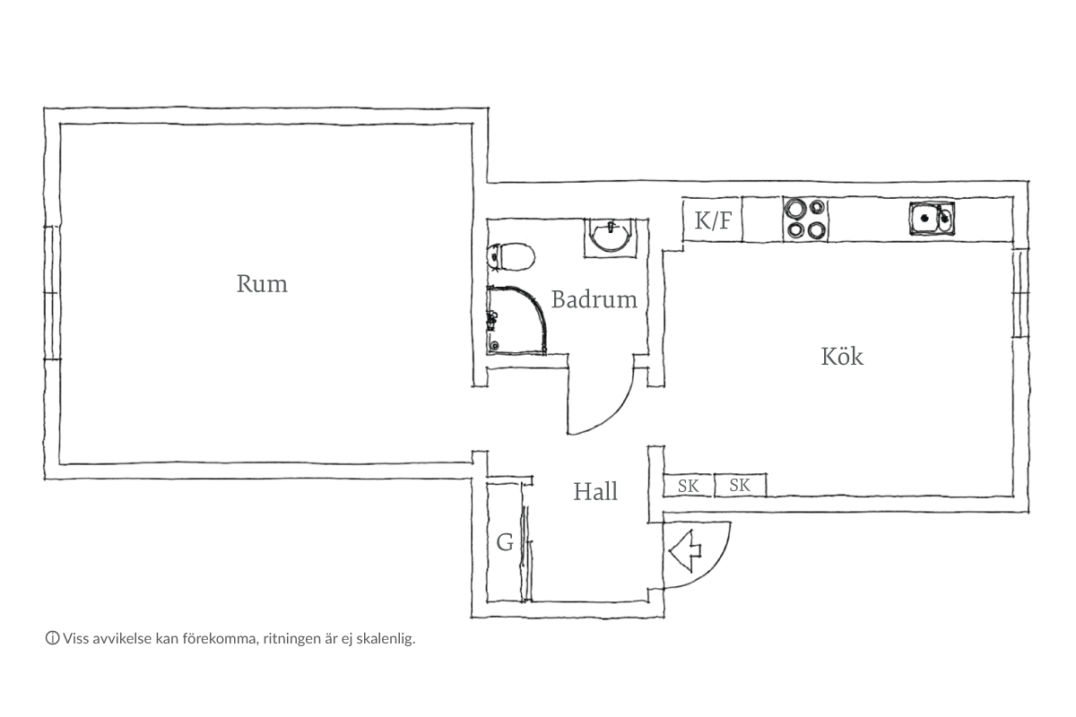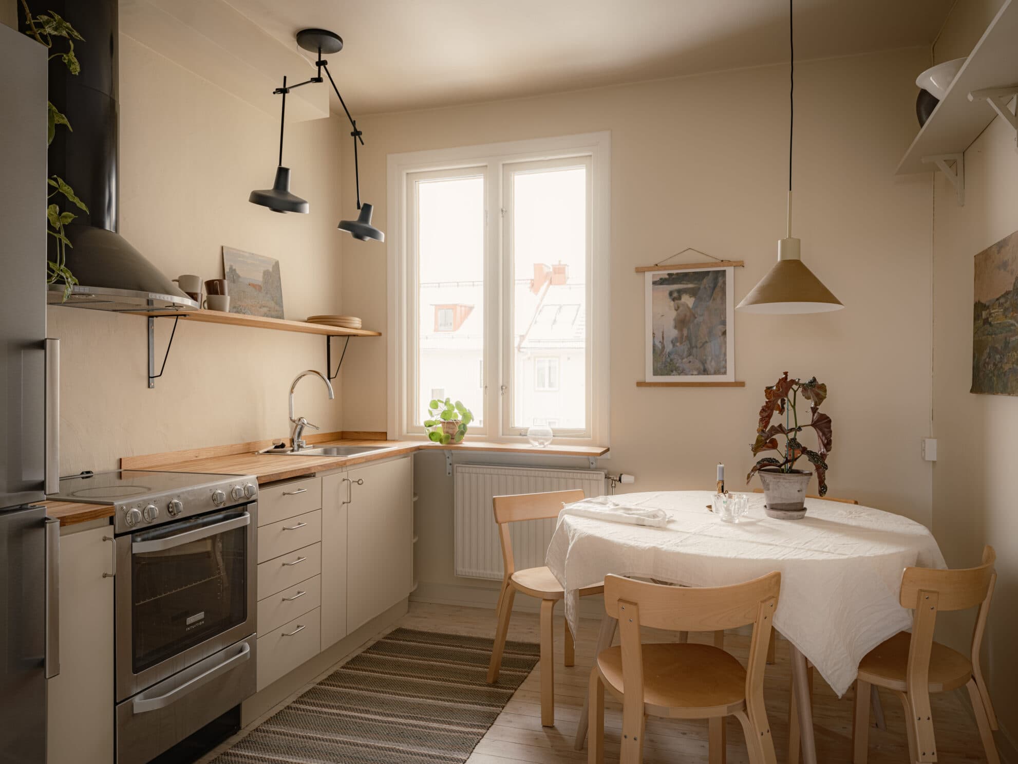 Köket är ovanligt rymligt för en etta och perfekt för dig som gärna samlar vänner kring middagsbordet. Här finns plats för ett matbord för fyra, och förvaringen är riklig tack vare en kombination av öppen hyllförvaring och släta skåp och lådor i en mjuk ljusgrå ton. Köksbänken i ek ger värme, och väggen ovanför, liksom övriga väggar, är målad i en lugn ljus beige. Den infällda diskhon, vitvaror i rostfritt och en svart fläkt ger ett modernt uttryck som balanseras av de framtagna brädgolven. Ljusgrå lister ramar in rummet.