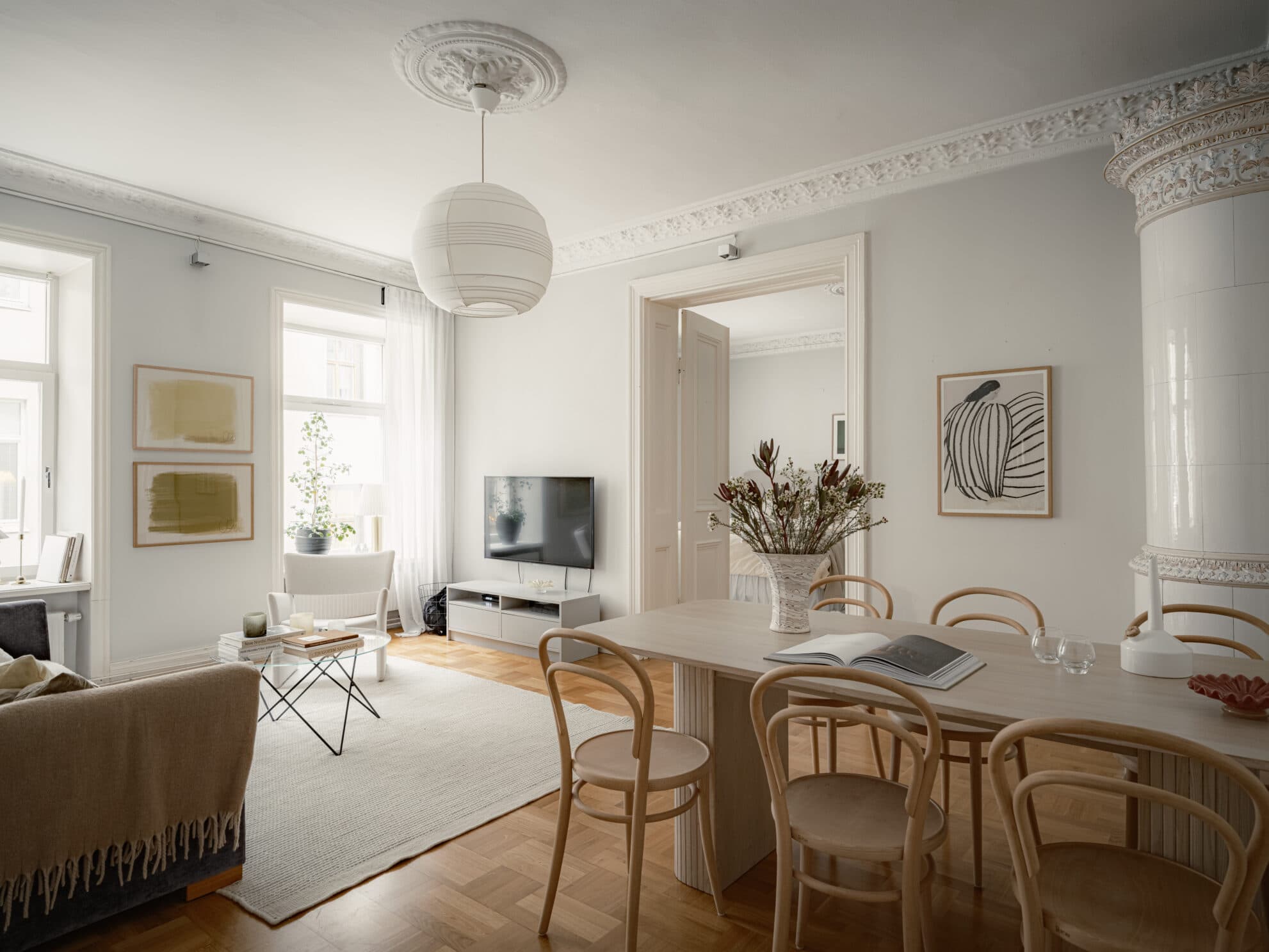 Ett elegant och ljust vardagsrum med vacker kakelugn som ger rummet både karaktär och charm. Stuckaturer och djupa fönsternischer framhäver lägenhetens klassiska stil, medan parkettgolvet i holländskt mönster skapar en stilfull helhet. Här finns gott om plats för både soffgrupp och matsalsmöblemang.
