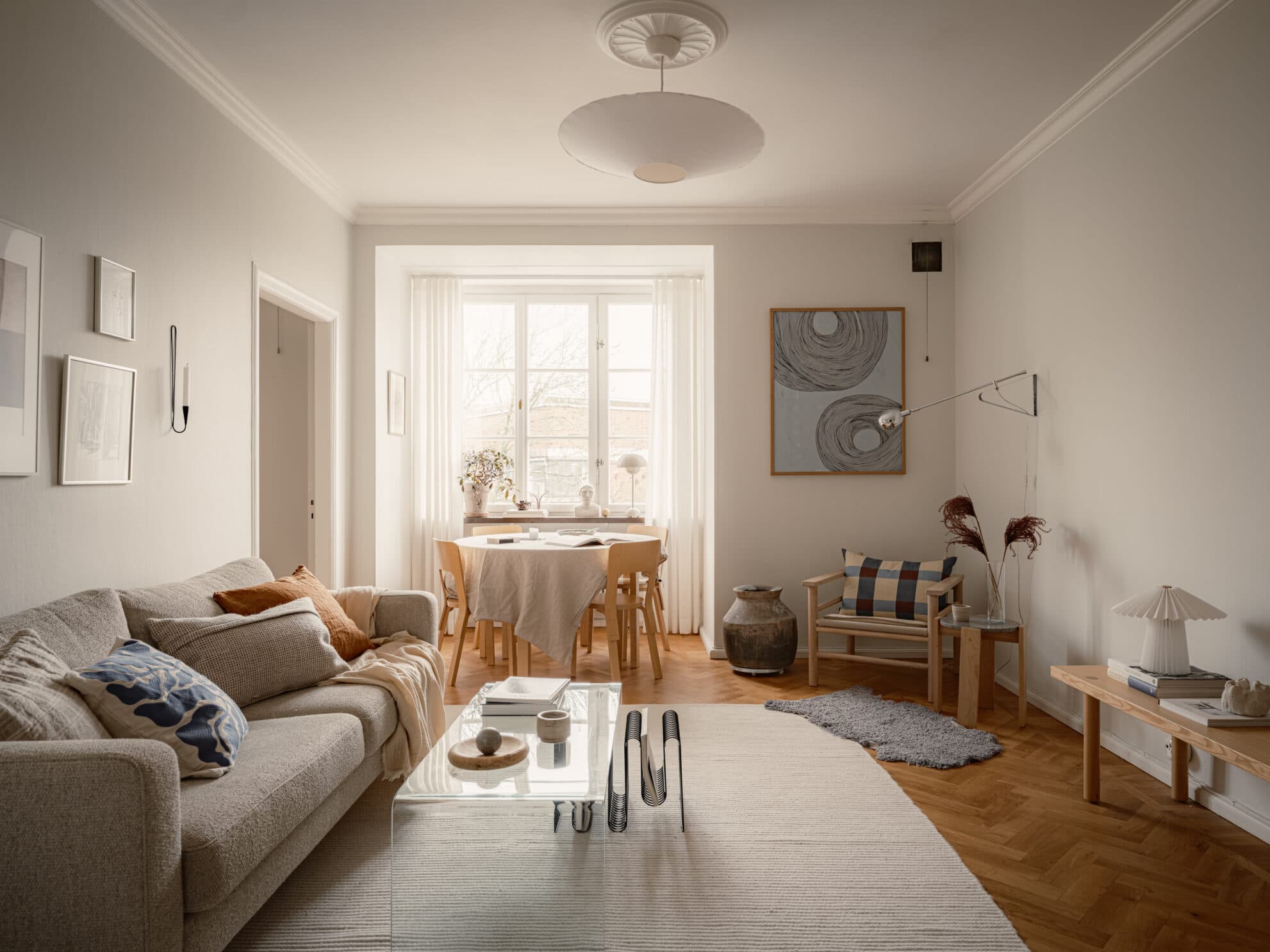 Ett smakfullt renoverat vardagsrum där tidstypiska detaljer lyfts fram med modern fingertoppskänsla. Väggarna är målade i den eleganta och mjukt dämpade kulören Tidlös från Jotun, vilket skapar en harmonisk och stilren bakgrund. Golvet utgörs av original fiskbensparkett, vars ådring och karaktär åter fått nytt liv efter slipning och behandling med OSMO Hårdvaxolja (2023). Den generösa takhöjden på 2,77 meter ger rummet en luftig atmosfär och låter de stora spröjsade fönsterpartierna (nyligen renoverade) flöda rummet med ljus. Sammantaget ett elegant och inbjudande rum där både material och proportioner samspelar i en klassisk ton.